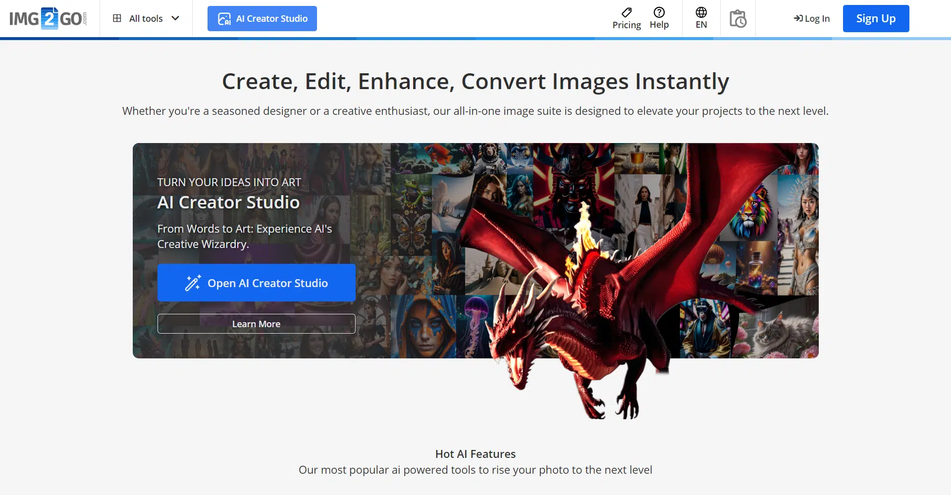 Unleash the wizardry of AI with our Creator Studio, where words seamlessly metamorphose into visually stunning art pieces. Elevate your photos with our hottest AI features, from upscaling and improving images with AI magic to effortlessly colorizing black and white wonders. Remove backgrounds like a pro, create captivating images with automatic face blurring, and discover an array of other tools that will redefine your image editing experience.
