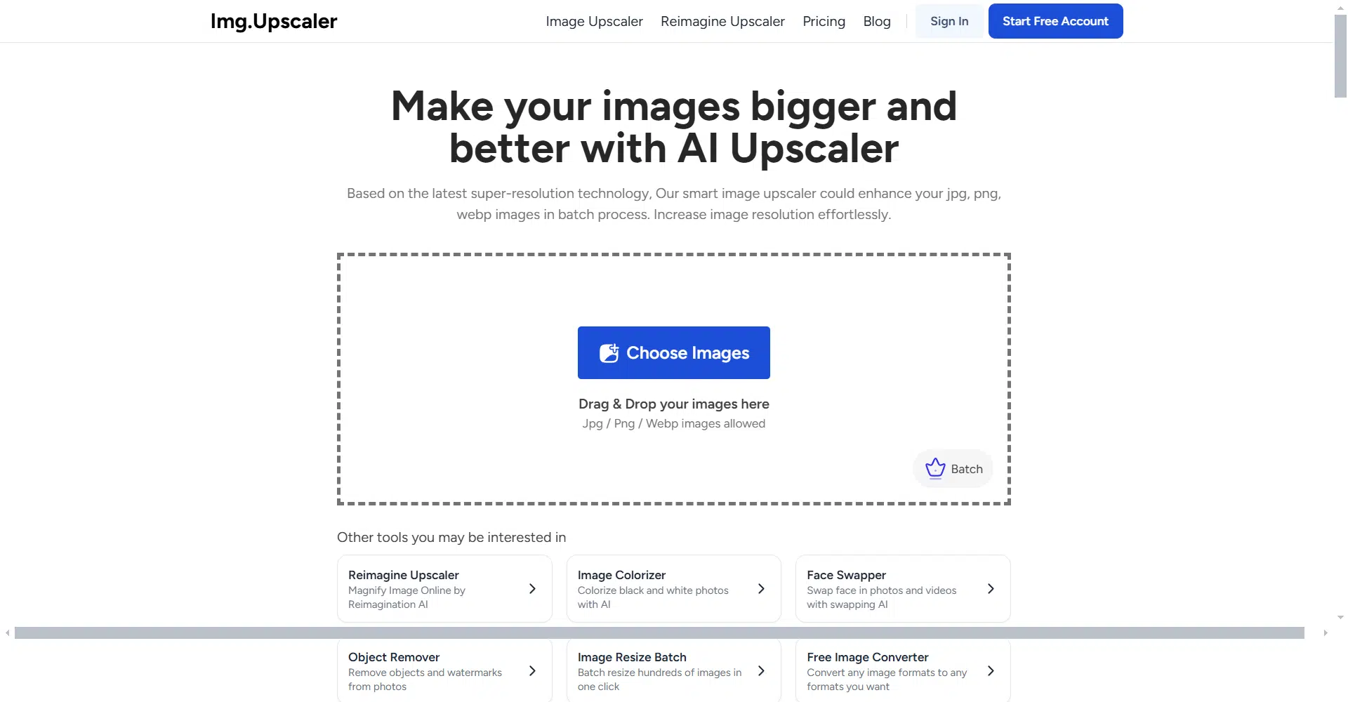 ImgUpscaler is a powerful tool that allows you to effortlessly make your images bigger and better using advanced AI technology. By leveraging the latest super-resolution technology, ImgUpscaler enhances your jpg, png, and webp images in a batch process, increasing their resolution without sacrificing quality. Whether you’re looking to improve photo details or enlarge an image for better clarity, ImgUpscaler makes it fast and simple.