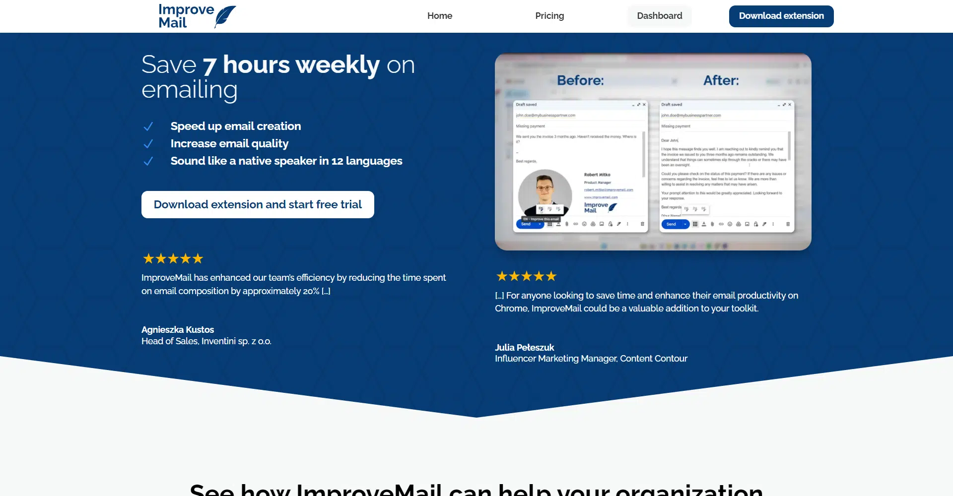 Transform the way you handle email with ImproveMail, the ultimate tool designed to save your time and boost your email quality. Imagine cutting down your weekly email workload by 7 hours while ensuring every email sounds professional and native in 12 different languages. That’s the power of ImproveMail.