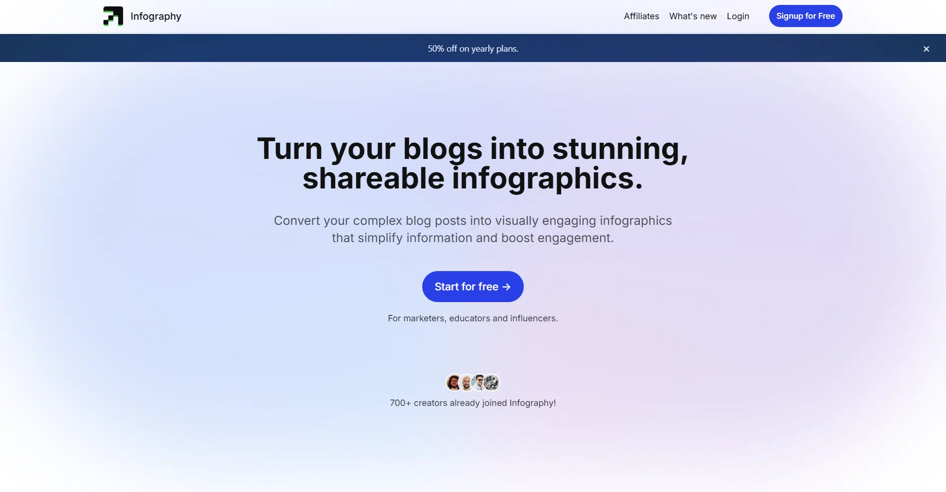 Infography makes it effortless to turn your blogs into stunning, shareable infographics that capture attention and simplify complex information. Whether your blog is packed with data, detailed guides, or product insights, this tool transforms your content into visually engaging graphics that boost engagement and make your message more memorable.