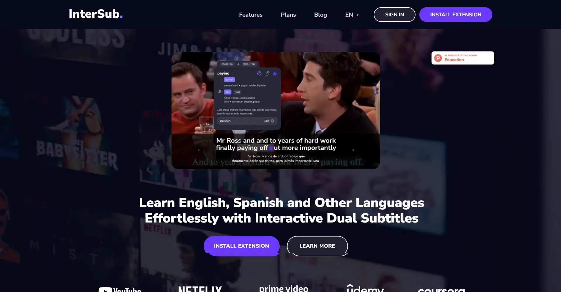 InterSub is a smart browser extension that turns your favorite shows and online courses into fun, interactive language lessons. Whether you’re watching Netflix, YouTube, Prime Video, TED, Coursera, Udemy, or even LinkedIn Learning, InterSub helps you learn new languages by adding interactive dual subtitles—so you see both your native language and the target language side by side.