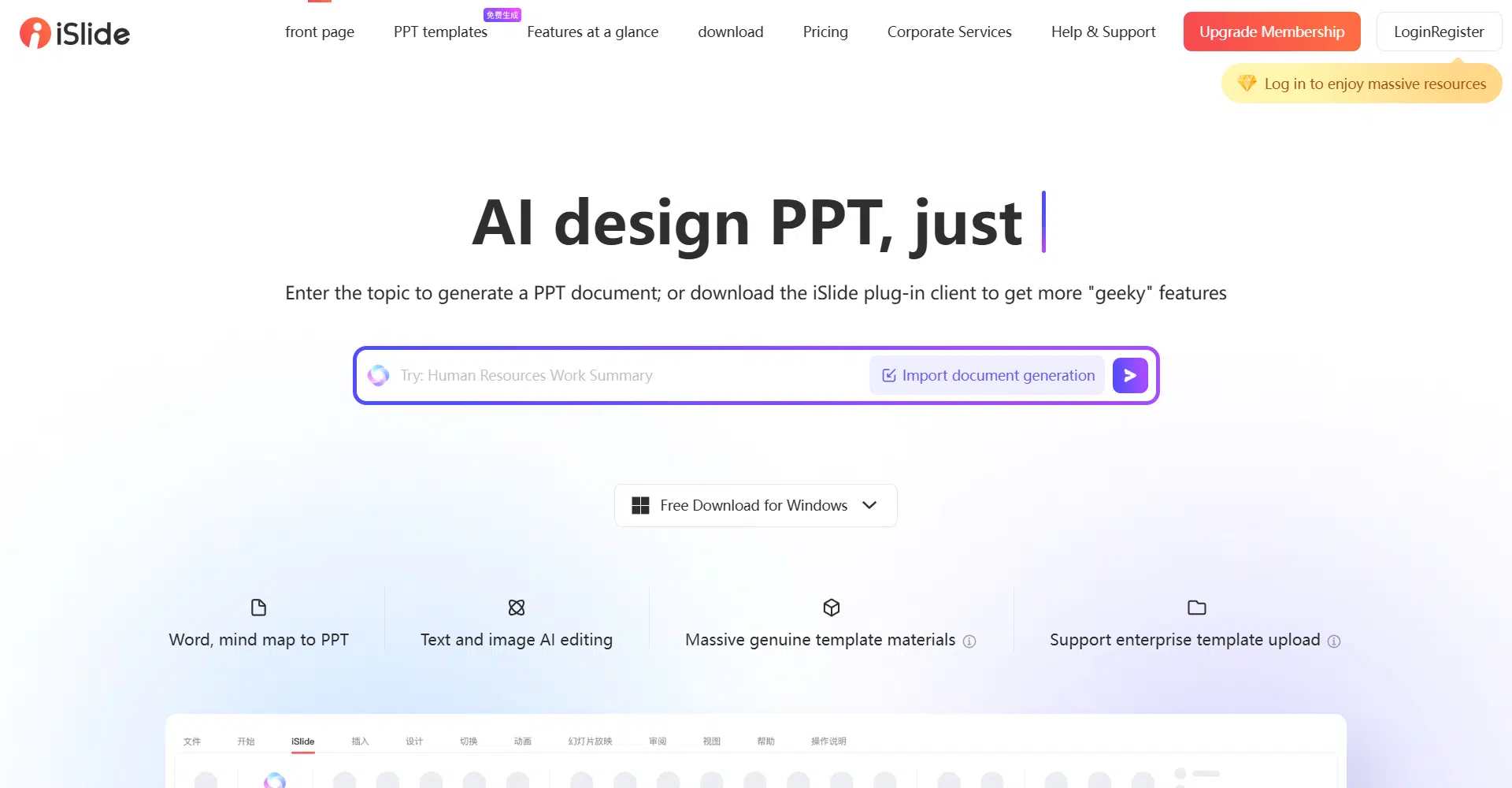 iSlide is a cutting-edge AI-powered design tool that transforms the way you create PowerPoint presentations. With just one simple step—entering your topic—iSlide’s AI instantly generates a complete, professional-quality PPT. Whether you need a quick work summary or a detailed report, this tool takes the heavy lifting out of presentation creation, so you can focus on your message. It supports importing and generating outlines from seven common document types, automatically parsing them to output polished slides with one click.