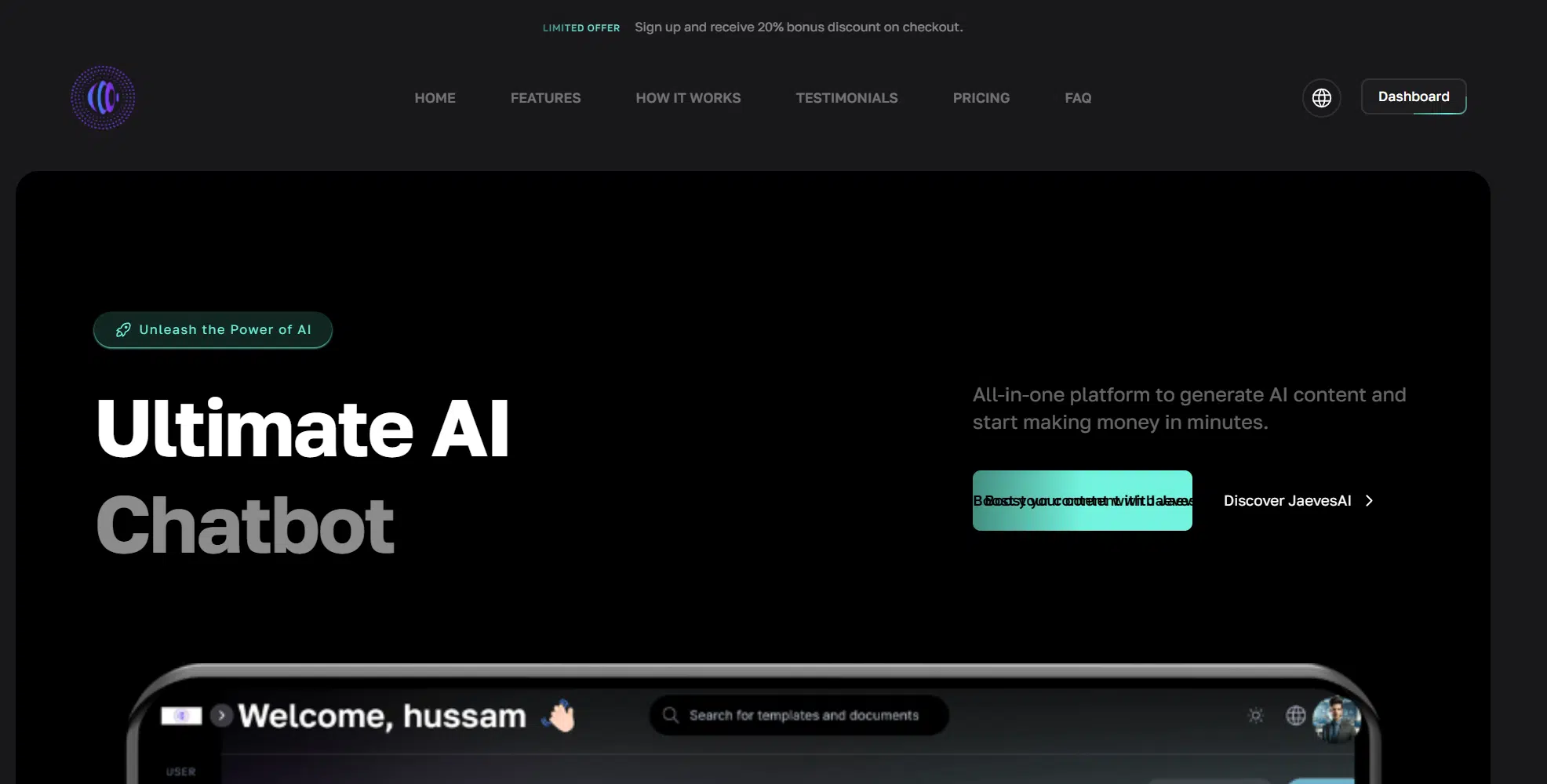 Transform ideas into reality with Jaeves AI—your all-in-one content generator that crafts stunning text, captivating visuals, and brilliant ideas effortlessly!"