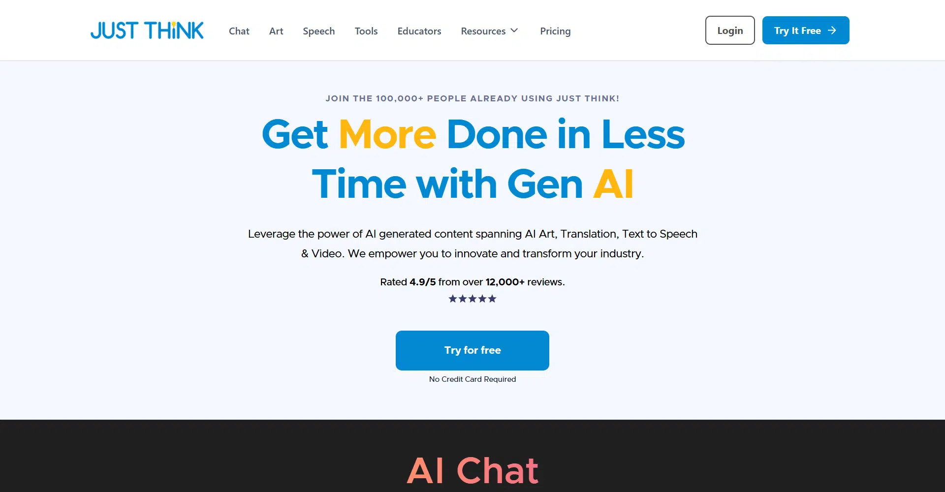 JustThink helps you get more done in less time by combining AI-generated content tools into one powerful platform. From AI Art and Translation to Text-to-Speech and Video creation, it gives you everything you need to create, innovate, and communicate faster. With a 4.9/5 rating from over 12,000 reviews, it’s trusted by thousands to boost productivity and spark creativity.