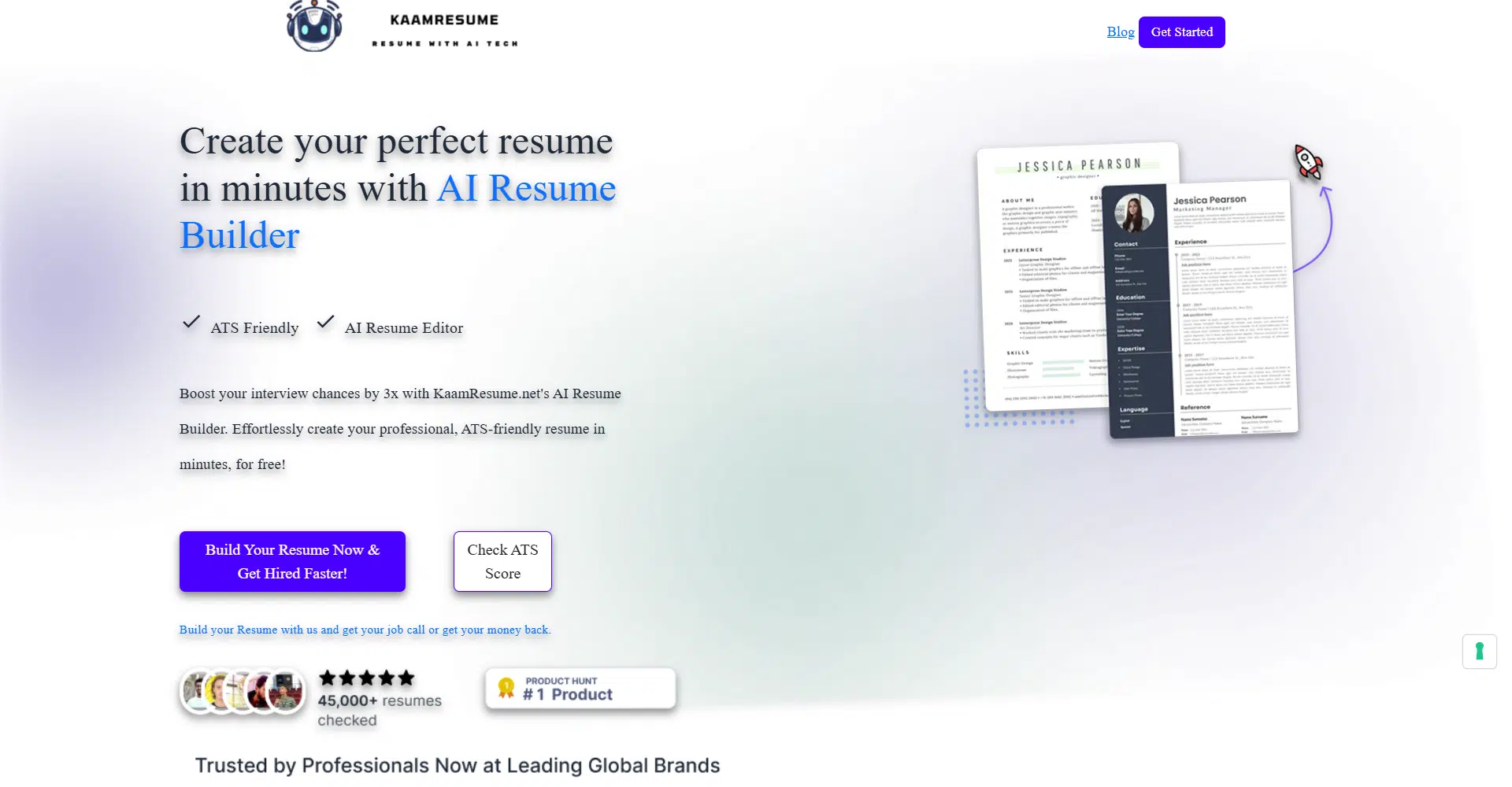 Kaam Resume is an AI-powered resume builder that makes creating a professional, ATS-friendly resume fast and easy. It helps job seekers avoid formatting hassles and common mistakes by offering a suite of tools designed to boost interview chances and optimize resumes for modern hiring systems. Users can choose from 20+ professionally designed templates, all optimized to pass applicant tracking systems (ATS), and refine their resume with personalized AI-powered suggestions to improve language, structure, and keyword usage.