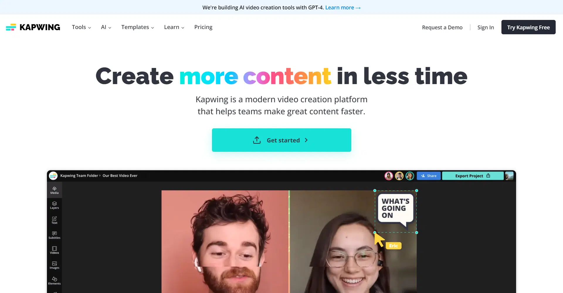 Working together is simple too. Kapwing is like Google Docs, but for videos. Your team can all work on videos at the same time, and everyone sees the changes right away.