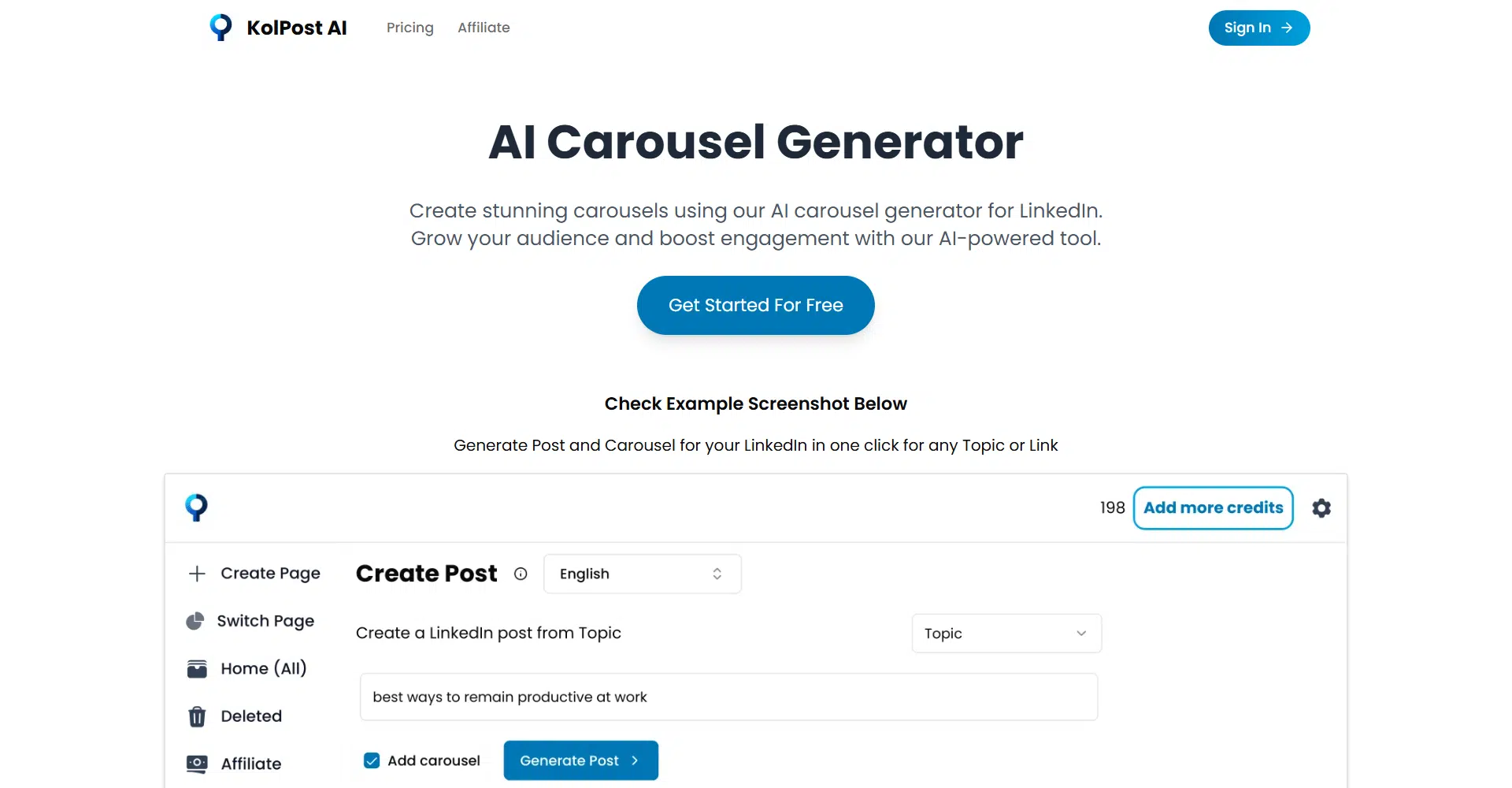 "Kolpost AI: Effortlessly create stunning carousels with AI—engage your audience and elevate your social media game in no time!"