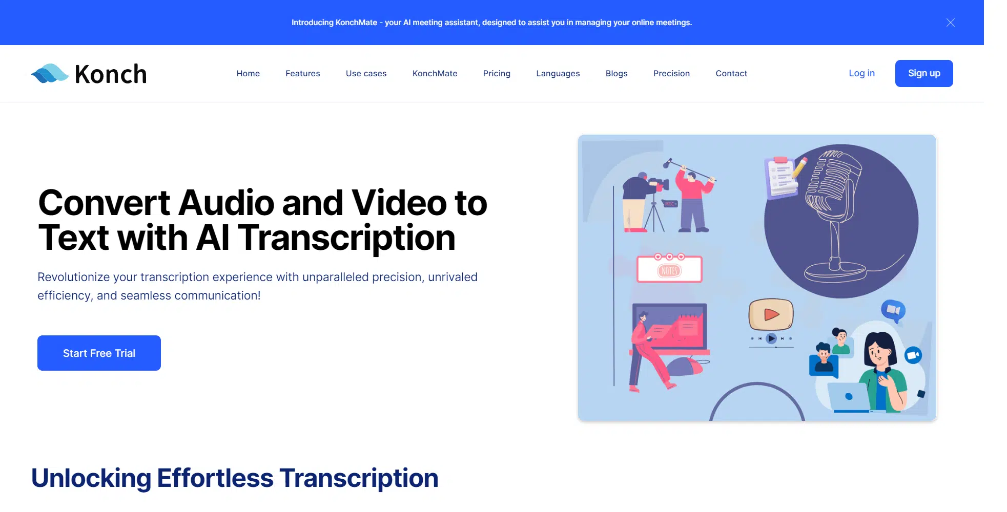 Transform your audio and video into accurate text with Konch AI transcription. Fast, reliable, and easy-to-use AI for all your transcription needs!