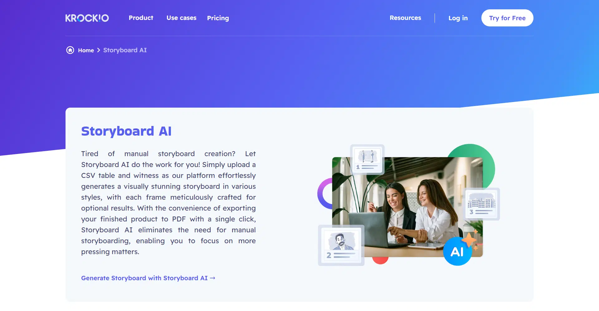 Krock’s Storyboard AI is revolutionizing storyboard creation with its powerful, automated features. Say goodbye to the tedious manual process and let their advanced AI tool handle it for you. Simply upload a CSV table, and watch as Storyboard AI generates stunning, visually appealing storyboards in various styles, tailored to your needs. Each frame is meticulously crafted to ensure high-quality results, allowing you to focus on other important aspects of your project.