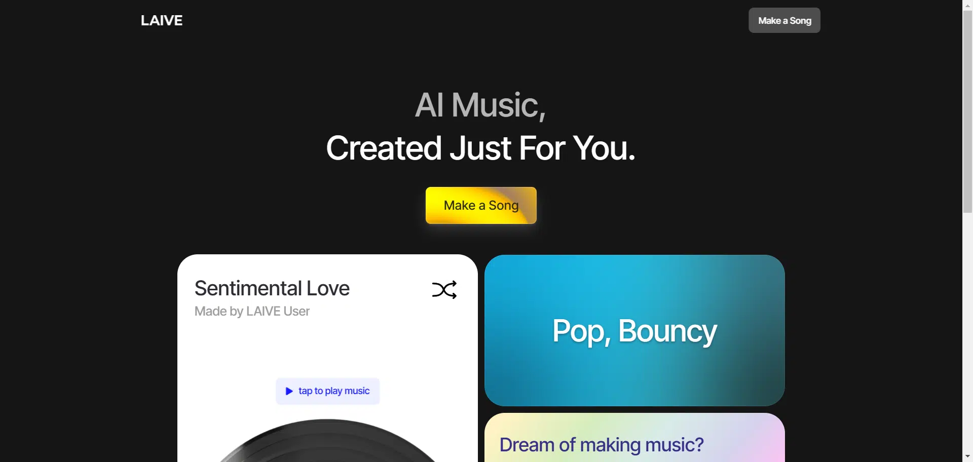 Laive supports customization, giving you control over the genre, tempo, and instruments used, helping you shape your sound exactly the way you want. Plus, it’s a great tool for experimenting with different ideas and discovering new musical directions.