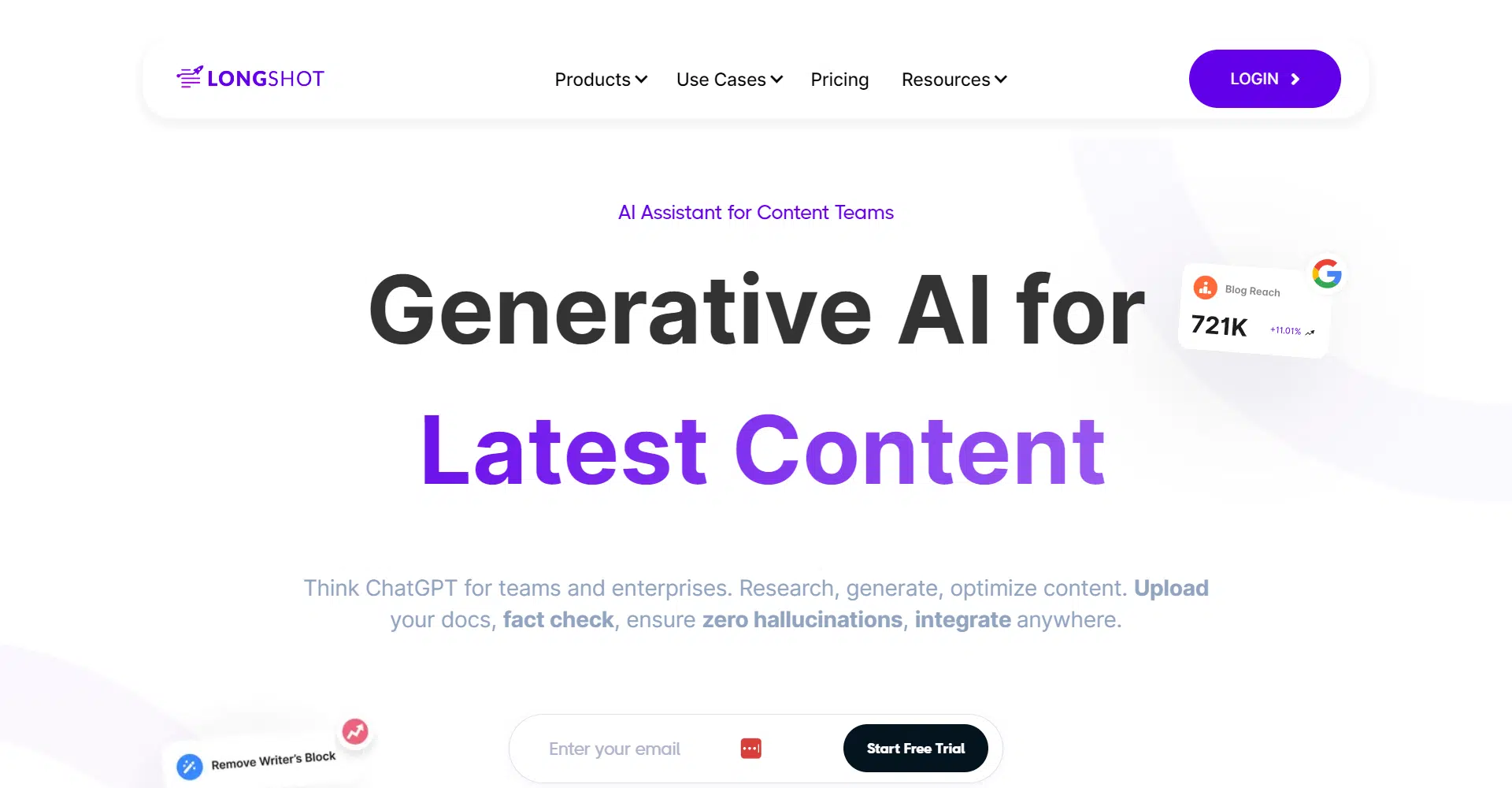 Introducing LongShot AI, the ultimate tool for content teams and enterprises seeking to revolutionize their content creation process! Imagine having an AI assistant at your fingertips, capable of generating fact-checked content, crafting one-click blogs, and seamlessly integrating with your favorite platforms—all with the click of a button.
