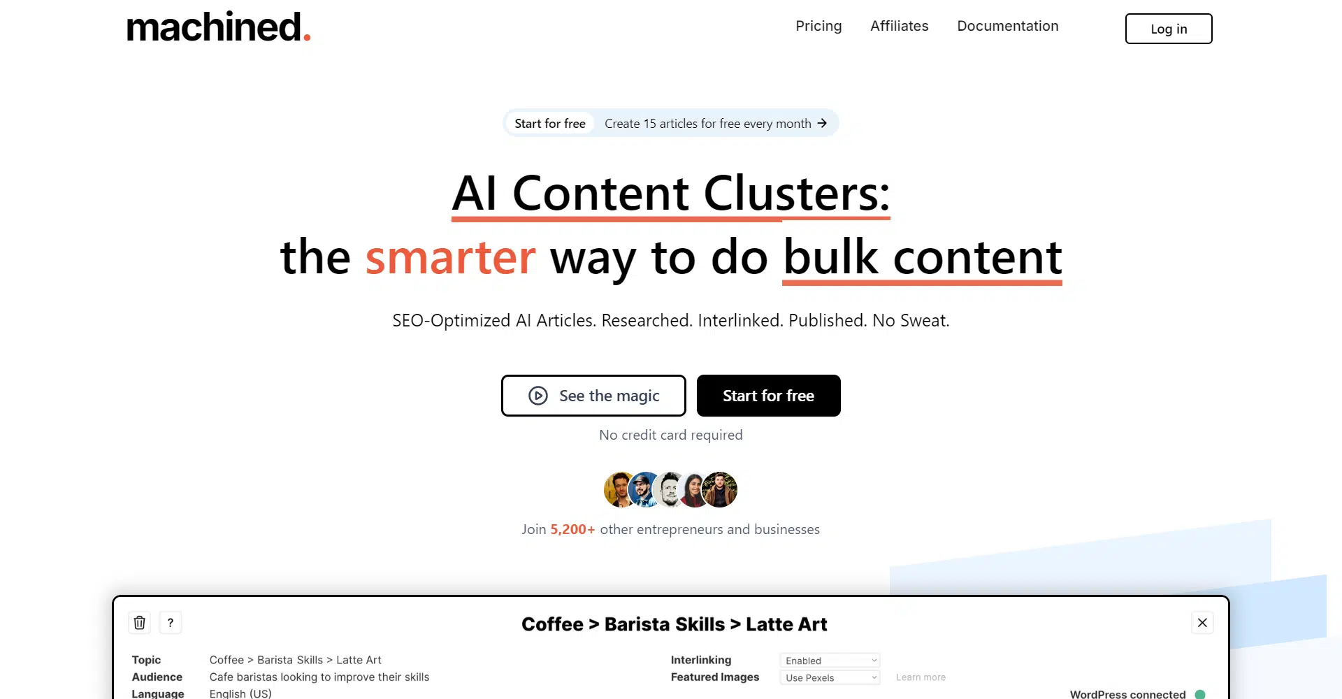 With Machined AI, SEO becomes effortless. The tool conducts automated keyword research using the latest data, ensuring your content clusters are packed with high-ranking keywords that work together seamlessly. It carefully avoids keyword cannibalization by clustering related terms for maximum impact. Machined also automates internal linking, creating natural-sounding, keyword-targeted anchor text for better on-site SEO.