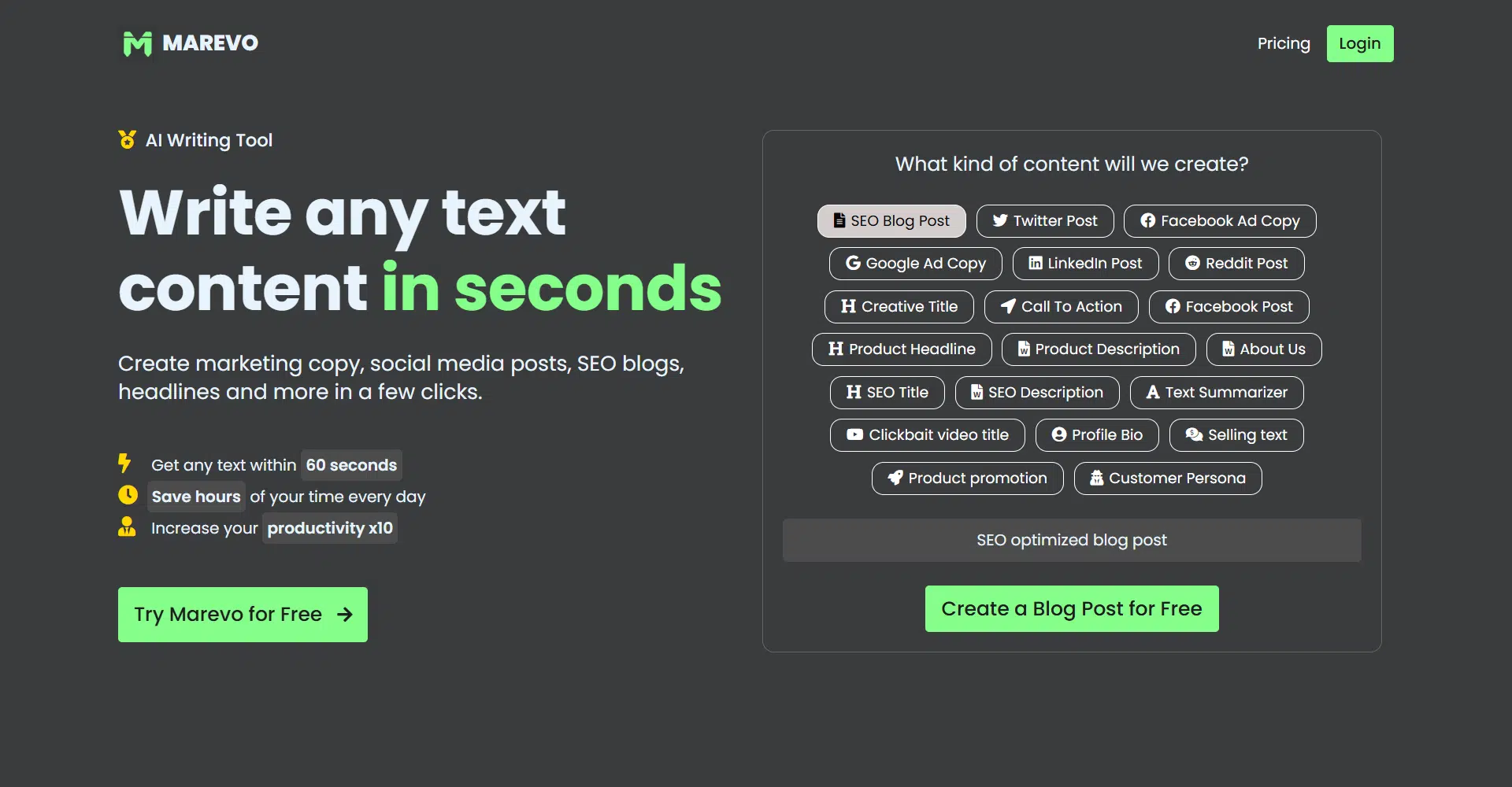 Marevo is the perfect solution for anyone who needs to create high-quality text content quickly and efficiently. Whether you’re writing an SEO blog post, crafting a Facebook ad copy, or generating a creative title, Marevo allows you to complete your content creation in seconds. This powerful tool helps you save hours of work every day and boosts your productivity by up to 10 times.