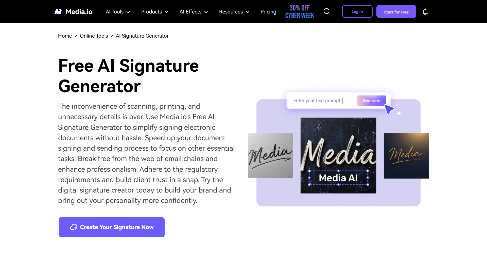 Media.io Free AI Signature Generator offers a simple and efficient way to create digital signatures without the hassle of printing or scanning documents. They allow users to generate personalized signatures instantly, helping individuals and businesses sign documents quickly and professionally. With a focus on ease of use, speed, and fully online access, they make it possible to create and apply signatures directly from a browser without any technical skills.