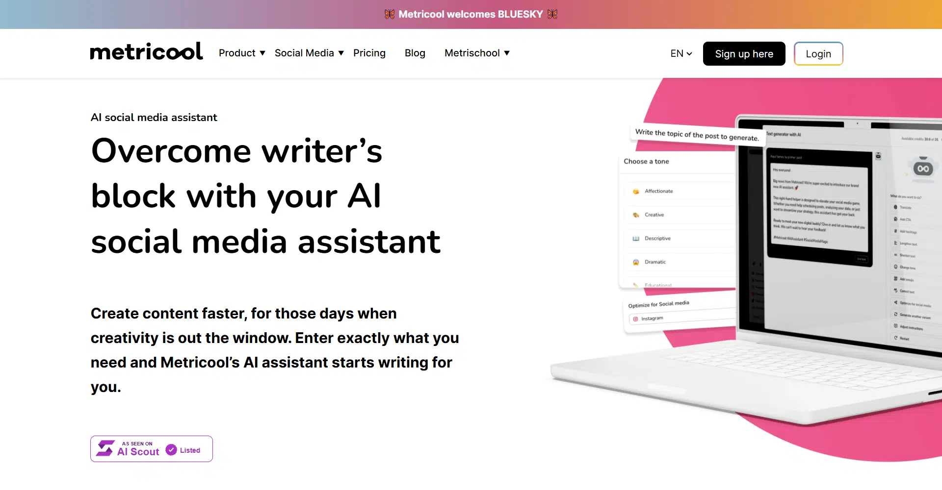 Metricool is your go-to AI social media assistant, designed to help you overcome writer’s block and create captivating content effortlessly. Whether you’re out of inspiration or simply pressed for time, Metricool’s assistant steps in as your personal social media copy wizard, crafting engaging posts in seconds.