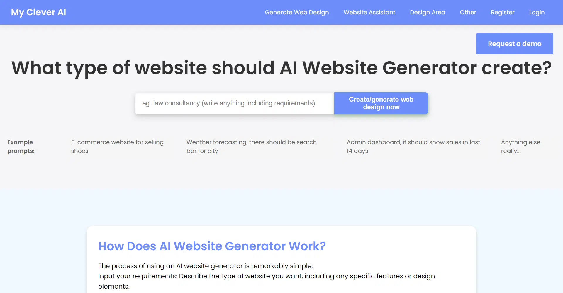 MyCleverAI is a powerful, user-friendly tool that makes building websites fast and effortless. With this AI website builder, users can create fully functional and customized websites in just a few minutes, without the need for months of development work. You can provide simple text instructions or even draw your designs for a more personalized touch, making the tool versatile for different needs and creative preferences.