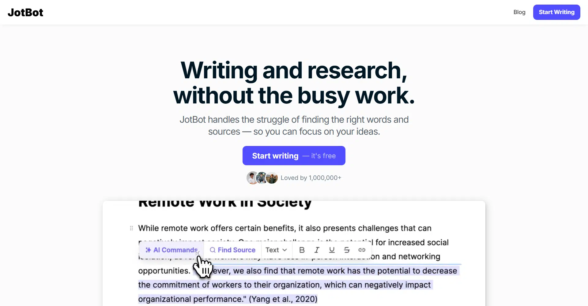 JotBot is loved by over a million users, including professionals, students, and top institutions, for its ability to streamline writing and boost productivity.