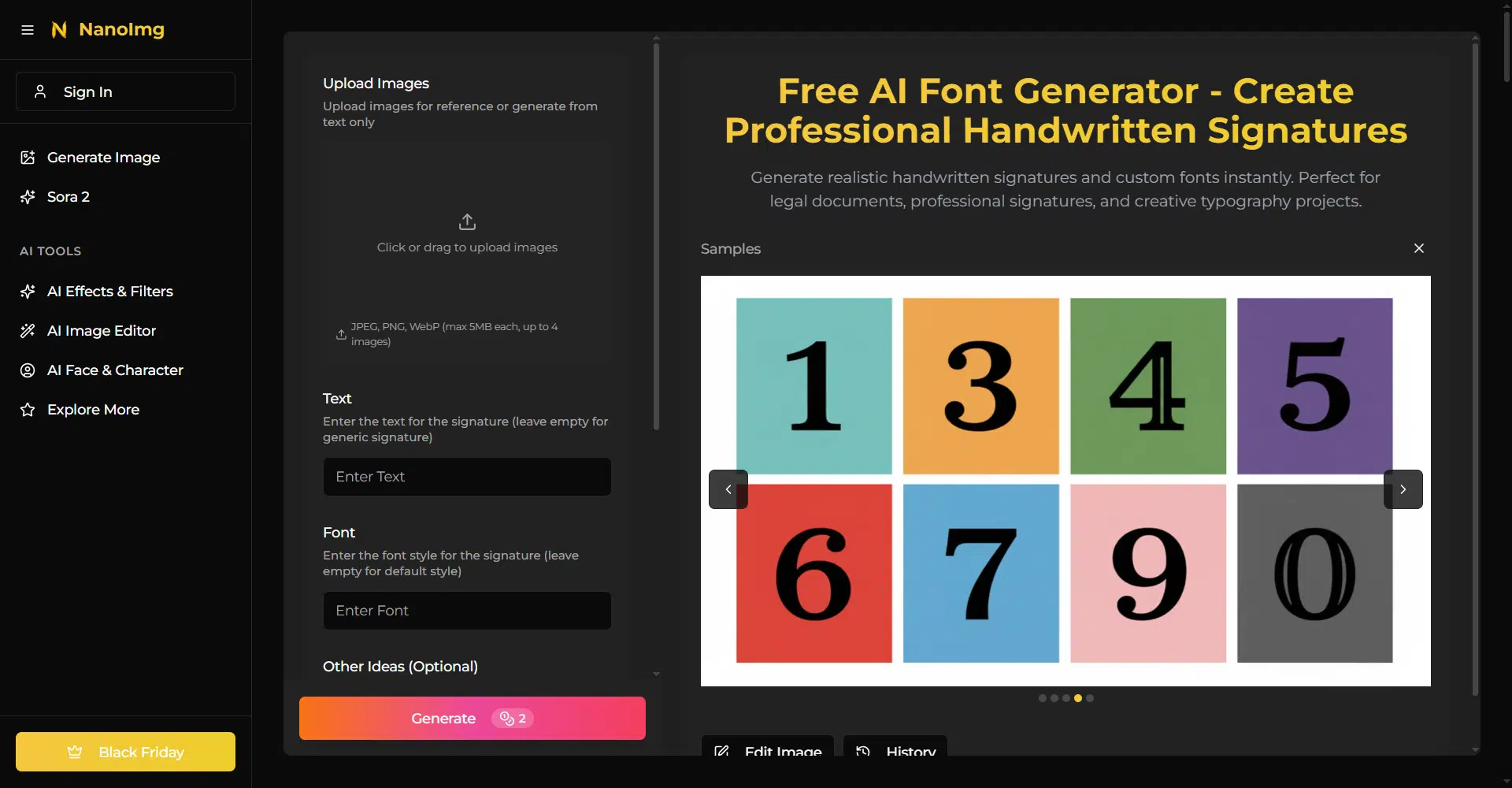 NanoImg AI Font Generator is a free AI-powered tool that helps users create realistic handwritten signatures and custom font styles in seconds. They make it easy to turn simple text into professional-looking signatures with natural pen pressure, smooth ink flow, and clean cursive styling, making it suitable for documents, branding, and creative typography projects.