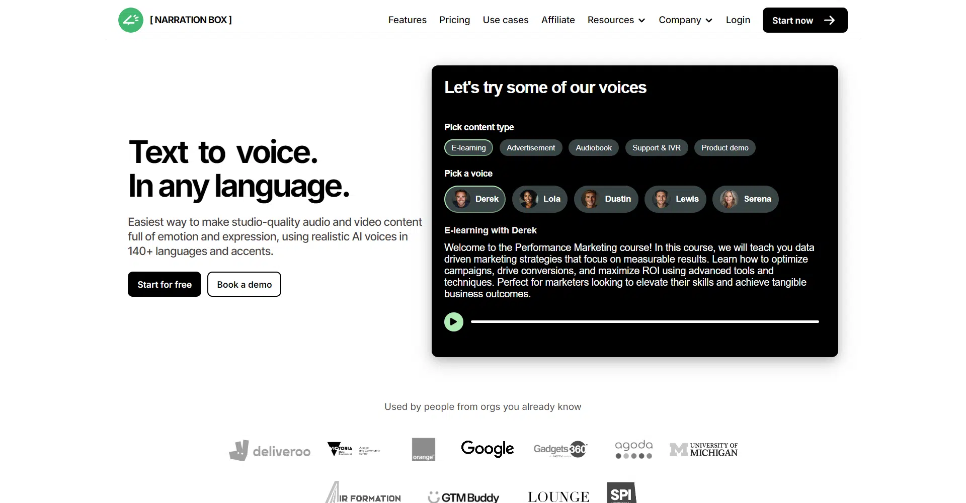 Narration Box transforms how you create audio and video content with its advanced AI-powered text-to-speech technology. Whether you’re making engaging voiceovers or realistic audio content, this platform offers a powerful suite of tools designed to elevate your projects with ease.