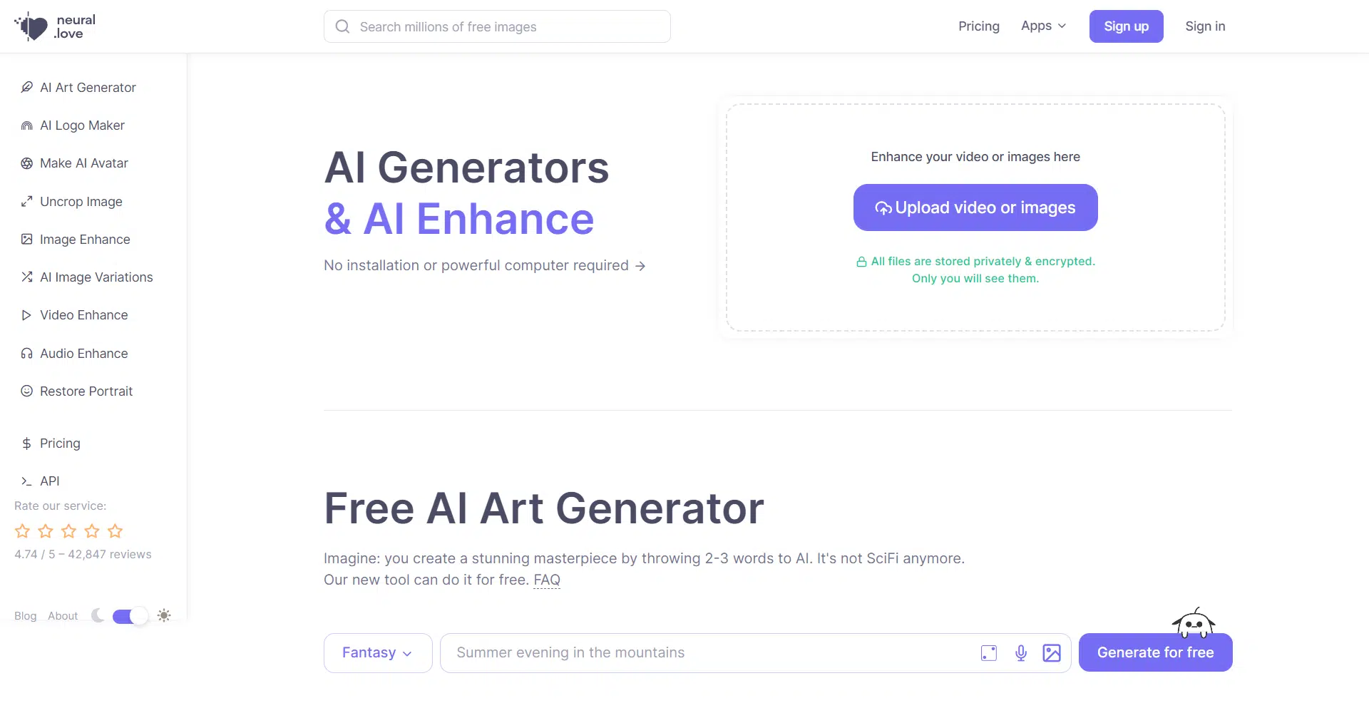 Embark on your AI-powered journey with our free trial! Enjoy 5 credits to explore unlimited art generations, enhance five images, revel in around 15 seconds of audio enhancement, or create a captivating portrait. While the free trial excludes video enhancement, the possibilities are boundless. Unleash your imagination and commence your neural-love adventure today!