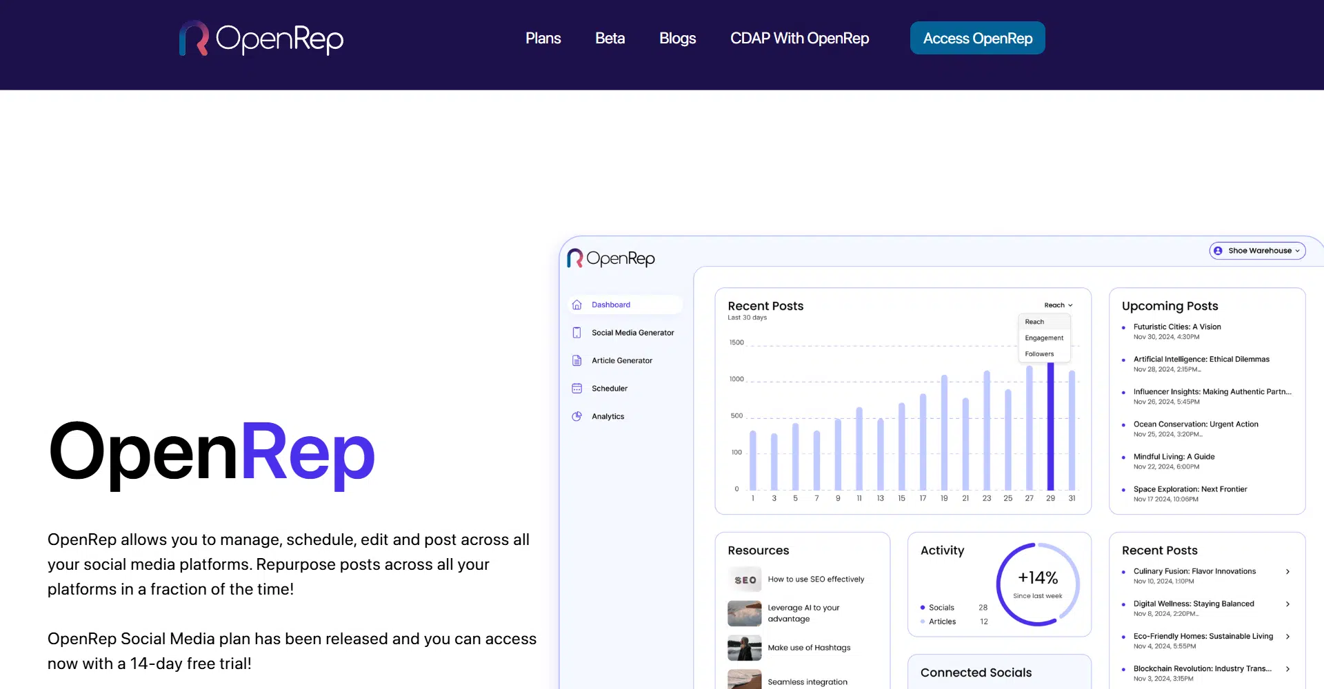 OpenRep makes social media management effortless by allowing you to manage, schedule, edit, and post across all your social platforms from one place. Whether you want to repurpose posts or share content across multiple platforms, OpenRep helps you do it in a fraction of the time.