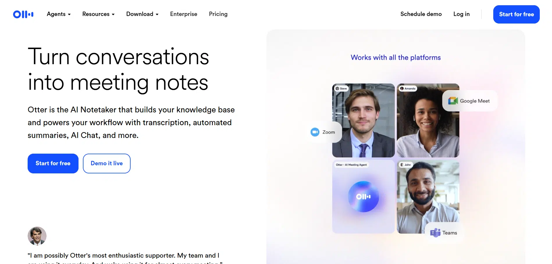 Otter AI is trusted by companies worldwide and supports various specialized notetakers for sales, education, media, SDR, and recruiting, allowing automated follow-ups, lecture notes, interview insights, and more.