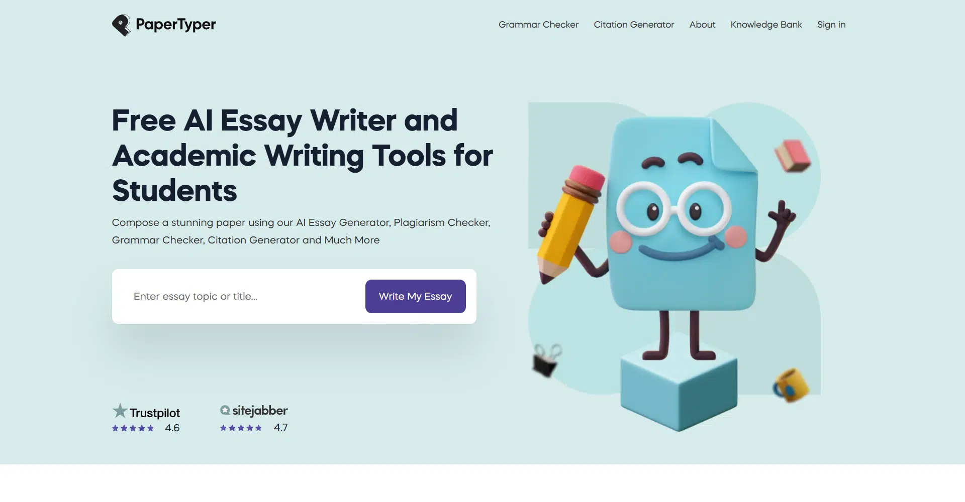 More than 50,000 students trust PaperTyper every month to improve their academic writing. Its powerful AI Essay Generator lets you turn your thoughts into full papers instantly. You’ll also get access to a plagiarism checker that makes sure your work is 100% unique, and a grammar checker that catches spelling, punctuation, and grammar mistakes before you hit submit. Plus, with the citation generator, you can create perfect references in MLA, APA, Chicago, or any other style in just seconds.