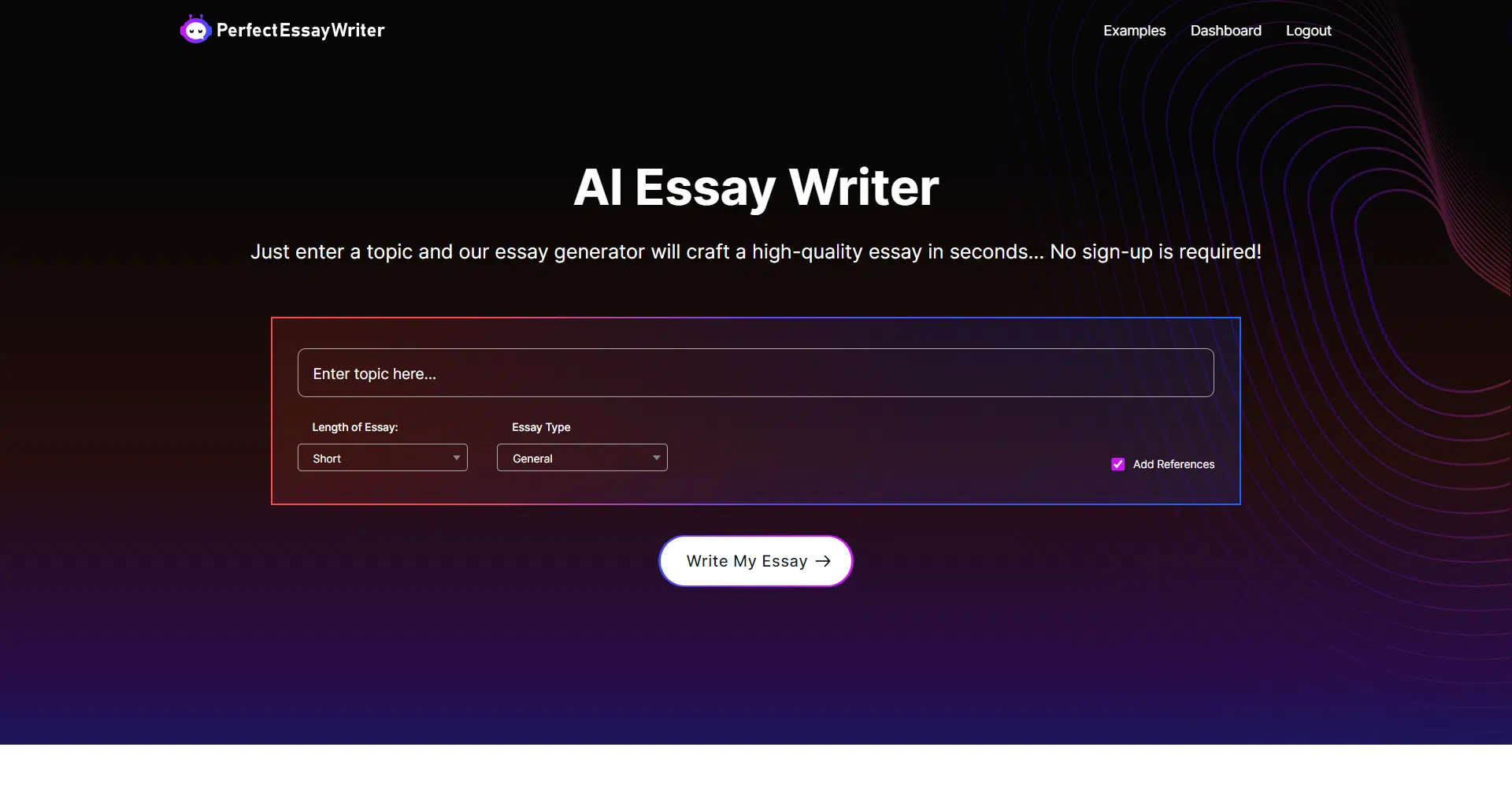 Best of all, PerfectEssayWriter offers a free trial, allowing you to experience the power of AI writing firsthand. No sign-up is required, and there are no hidden fees—just instant access to our state-of-the-art essay generator and writing tools. So why wait? Try PerfectEssayWriter today and revolutionize your writing experience with the click of a button!