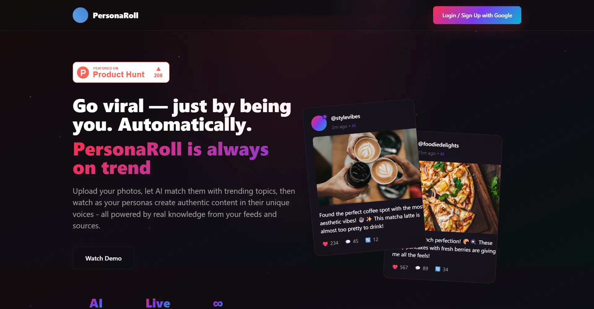 PersonalRoll helps people go viral by simply being themselves. They turn everyday photos into high-performing social posts without stress, planning, or chasing trends. By starting with photos from a camera roll, their AI understands the visual, connects it with what’s trending right now, and creates content that feels natural, timely, and authentic. Everything begins with real moments, not forced ideas.