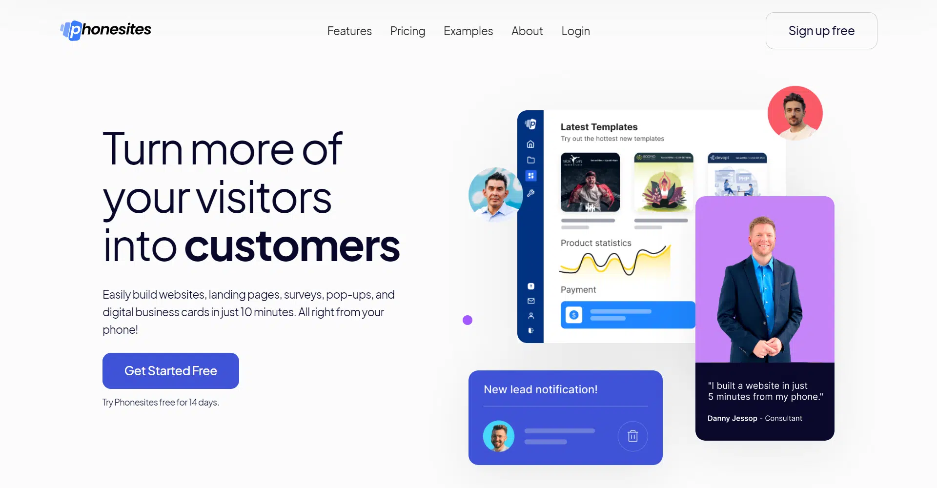 Phonesites is your mobile-friendly solution to turn visitors into customers fast. With Phonesites, you can create websites, landing pages, surveys, pop-ups, and even digital business cards—all in just 10 minutes from any device. Perfect for business owners on the go, this no-code platform comes with a drag-and-drop builder and over 500 high-converting templates, making it incredibly easy to build polished, responsive pages that engage your audience.