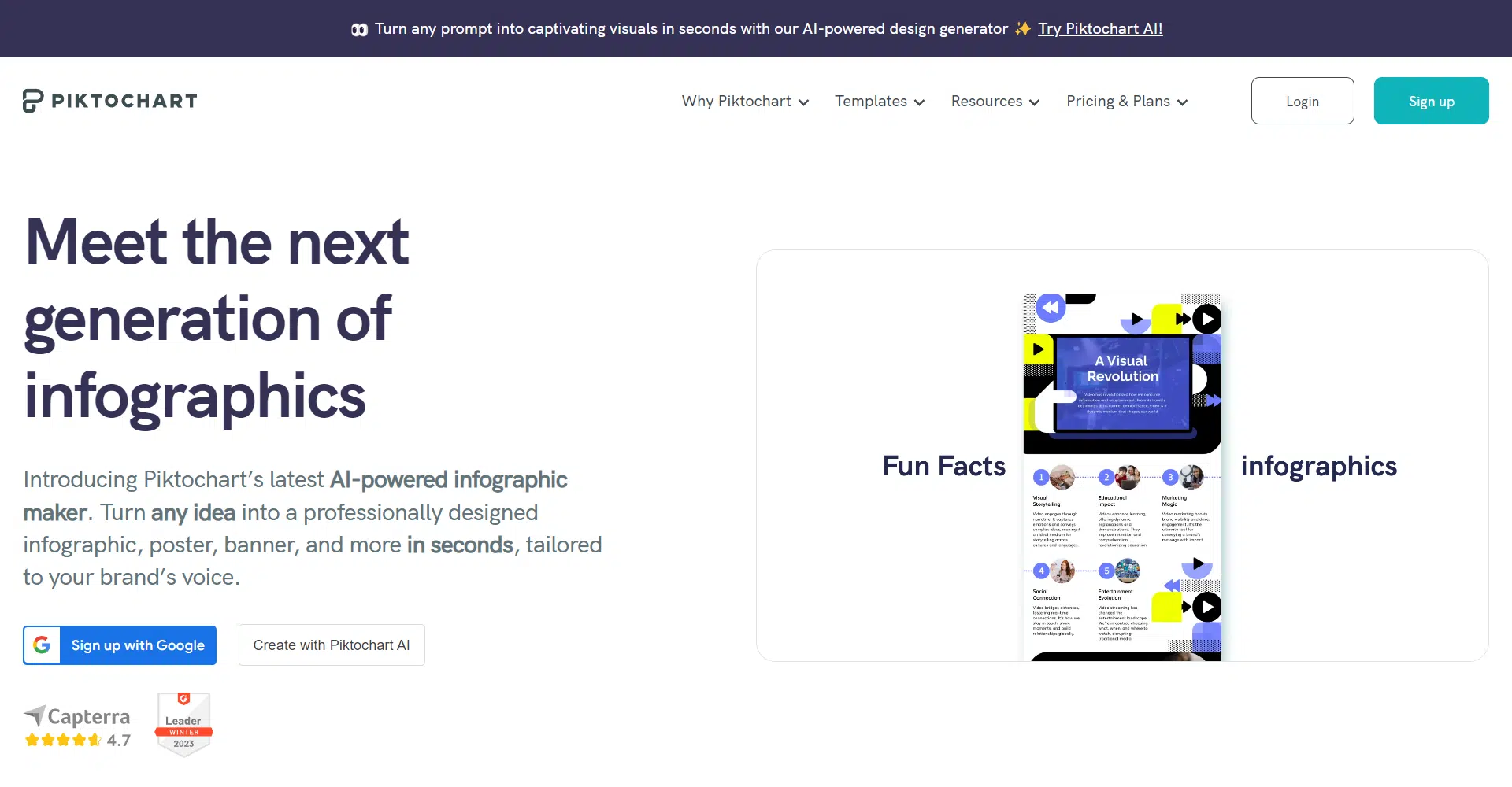 Best of all, they offer a free plan! You can enjoy 2 PNG downloads, unlimited visual projects, and 10 AI visual generations per month to explore its full potential without cost. Dive into the future of design with Piktochart today, where creativity meets simplicity!
