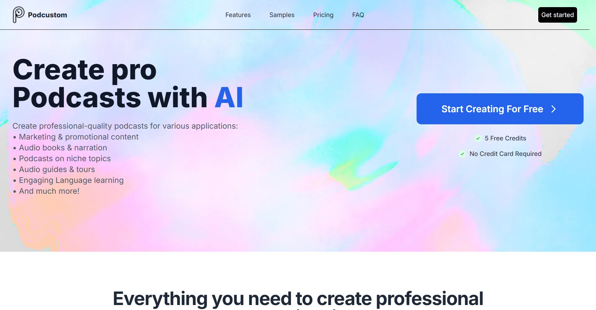 Best of all, PodCustom offers a free plan to get you started. You’ll receive 5 credits to explore all its features and experience how easy it is to create professional podcasts. Dive in today and let PodCustom turn your ideas into audio masterpieces!