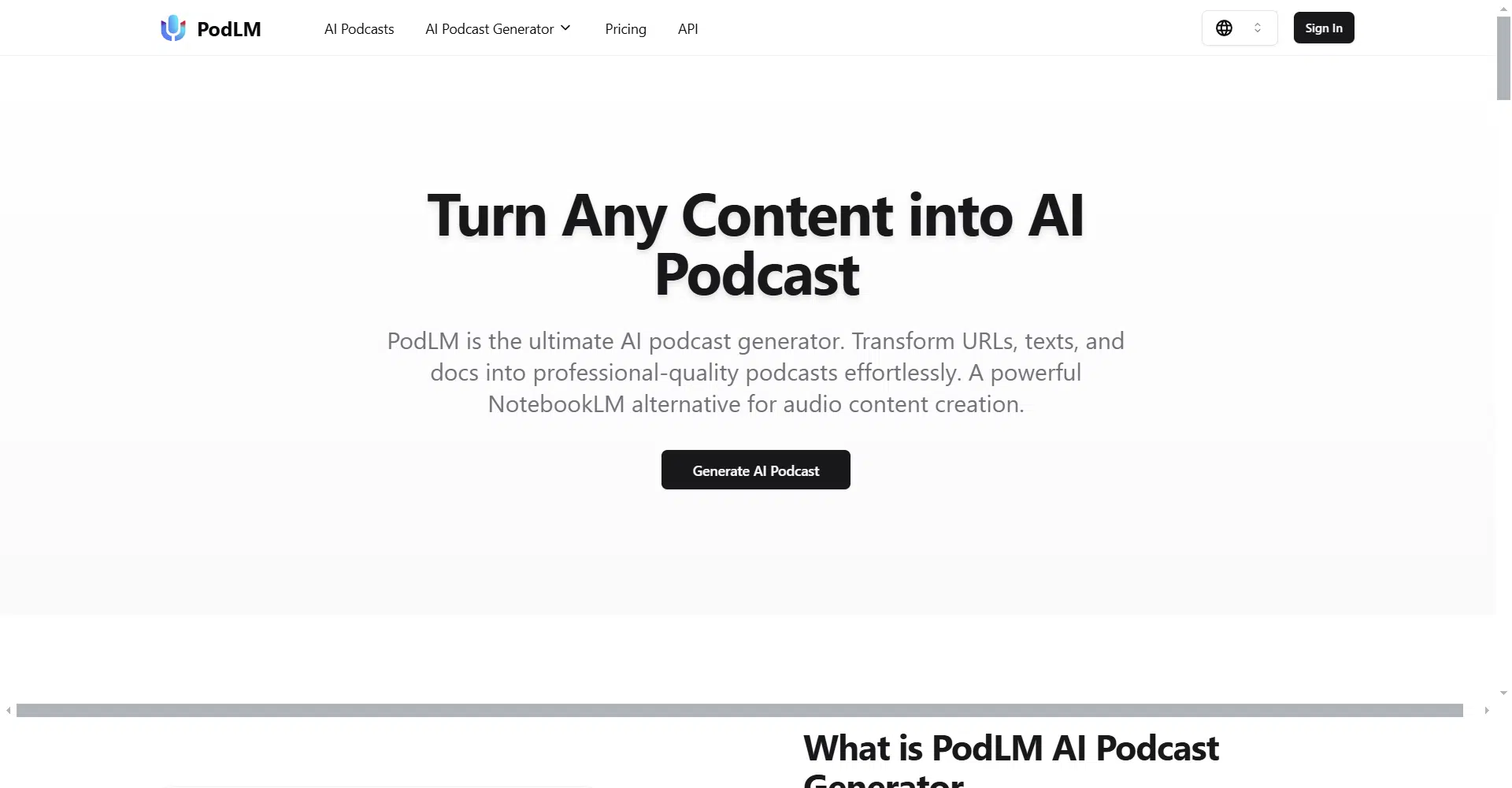 PodLM is a cutting-edge AI-powered podcast generator designed to effortlessly transform any written content into professional-quality audio podcasts. Whether you have a URL, text, or document, PodLM’s advanced algorithms allow you to quickly convert your content into an engaging podcast. This tool is an ideal alternative to general content creation platforms like NotebookLM, offering tailored solutions for podcast creation.