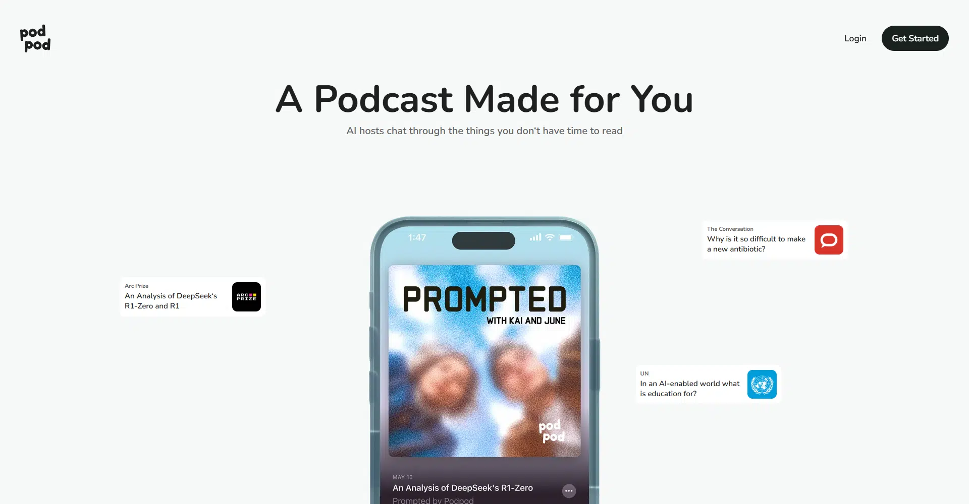 PodPod turns your reading list into a personal podcast—automatically. Whether it’s news articles, blog posts, or newsletters, PodPod converts them into audio episodes hosted by unique AI-generated voices tailored to your preferences. Instead of skimming through endless links, you can now listen to the content you don’t have time to read, on the go.