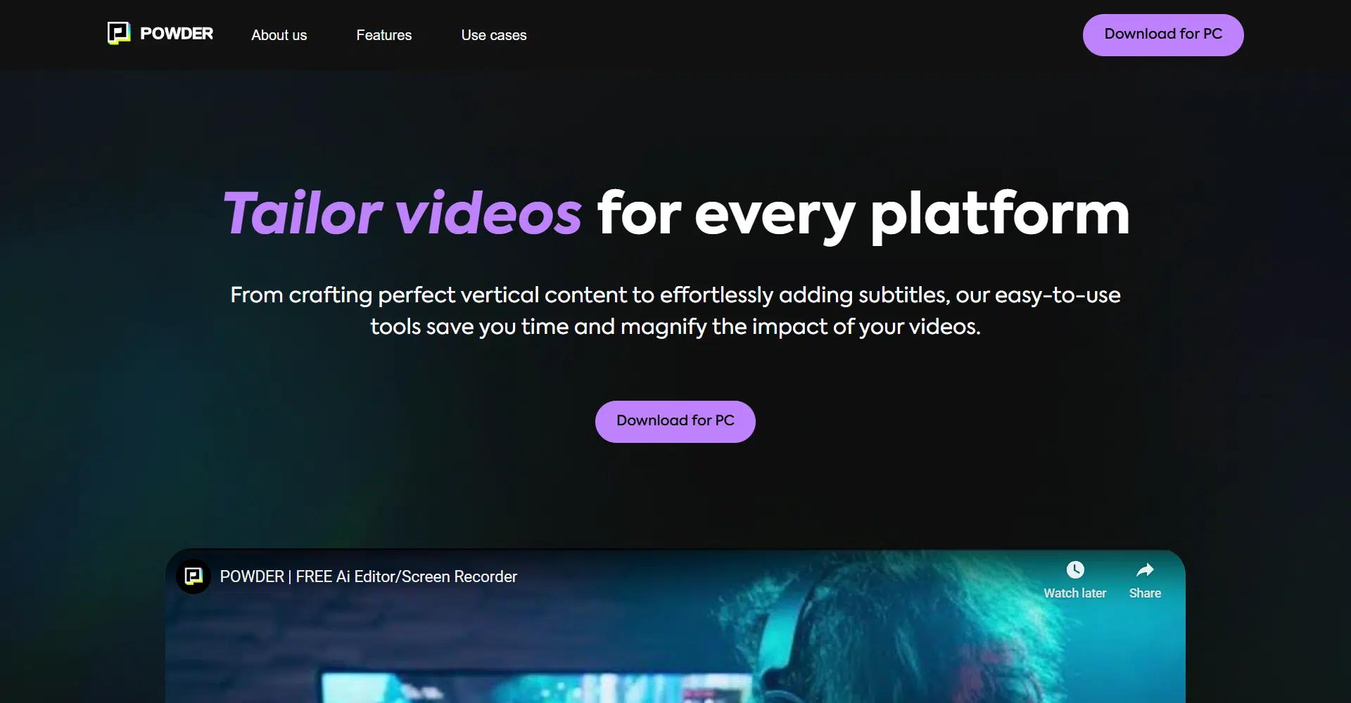 Powder is the ultimate AI-powered video editing tool designed to make your content stand out across every platform. Whether you’re crafting captivating vertical videos for TikTok or polished horizontal clips for YouTube, Powder’s intuitive tools ensure your videos are always optimized and professional-looking. With features like automatic montages, precise subtitles, and easy aspect ratio toggling between 9:16, 16:9, and soon 4:3 and 1:1, you can tailor your content effortlessly for Instagram, LinkedIn, Snapchat, and more.
