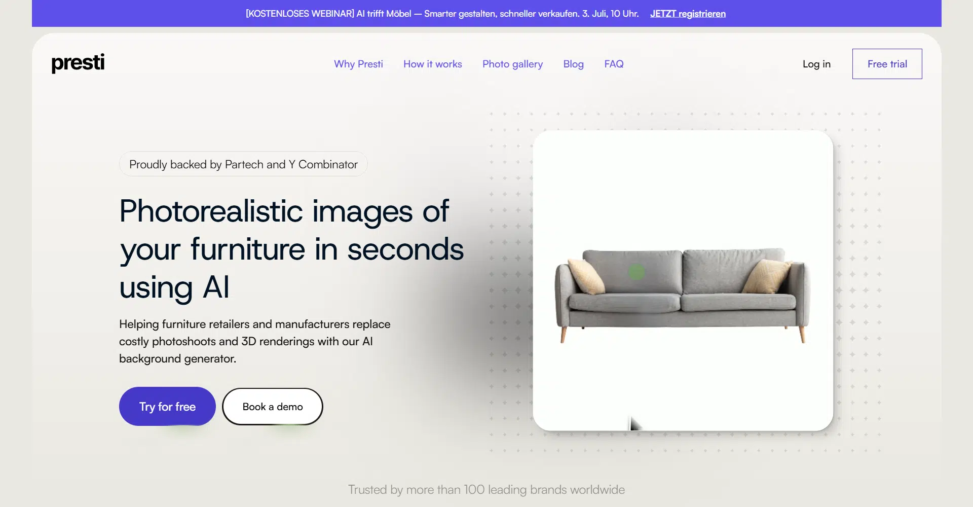 With Presti, creating stunning lifestyle images for your furniture products has never been easier. This AI-powered tool transforms simple packshots into beautiful, photorealistic visuals that look like they came from a high-end studio—without the time, cost, or hassle of traditional photoshoots. Whether you’re launching a new product or updating your catalog, it helps you generate marketing-ready images in seconds.
