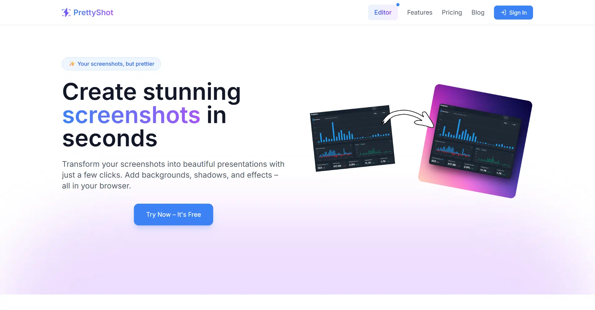PrettyShot is an AI-powered tool that transforms your plain screenshots into stunning visual presentations — all within your browser. Whether you’re showcasing a product, preparing a report, or creating content for social media, PrettyShot helps you turn boring screenshots into polished, professional images in just a few clicks.
