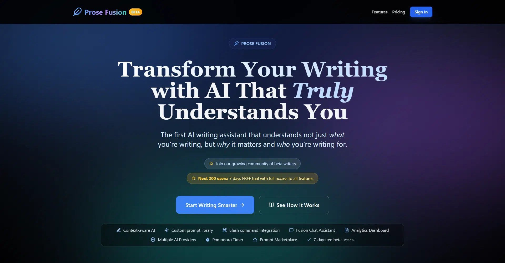 ProseFusion is a game-changing AI writing assistant designed to make your writing process smoother, more efficient, and more creative. Unlike other writing tools, ProseFusion truly understands not just what you’re writing, but why it matters and who you’re writing for. It solves common struggles like disorganized ideas, creative blocks, and wasted hours spent on editing. With its personalized prompt library and dynamic content integration, you’ll have AI-powered assistance that’s context-aware, helping you craft better content without breaking your flow.