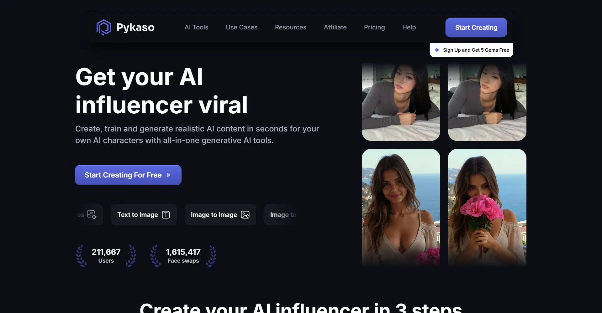 Best of all, Pykaso offers a free plan to get you started risk-free. You’ll receive 5 gems to generate realistic AI content and explore the platform’s powerful features. If you’re ready to create viral AI influencers and monetize your creativity, Pykaso is the place to begin.