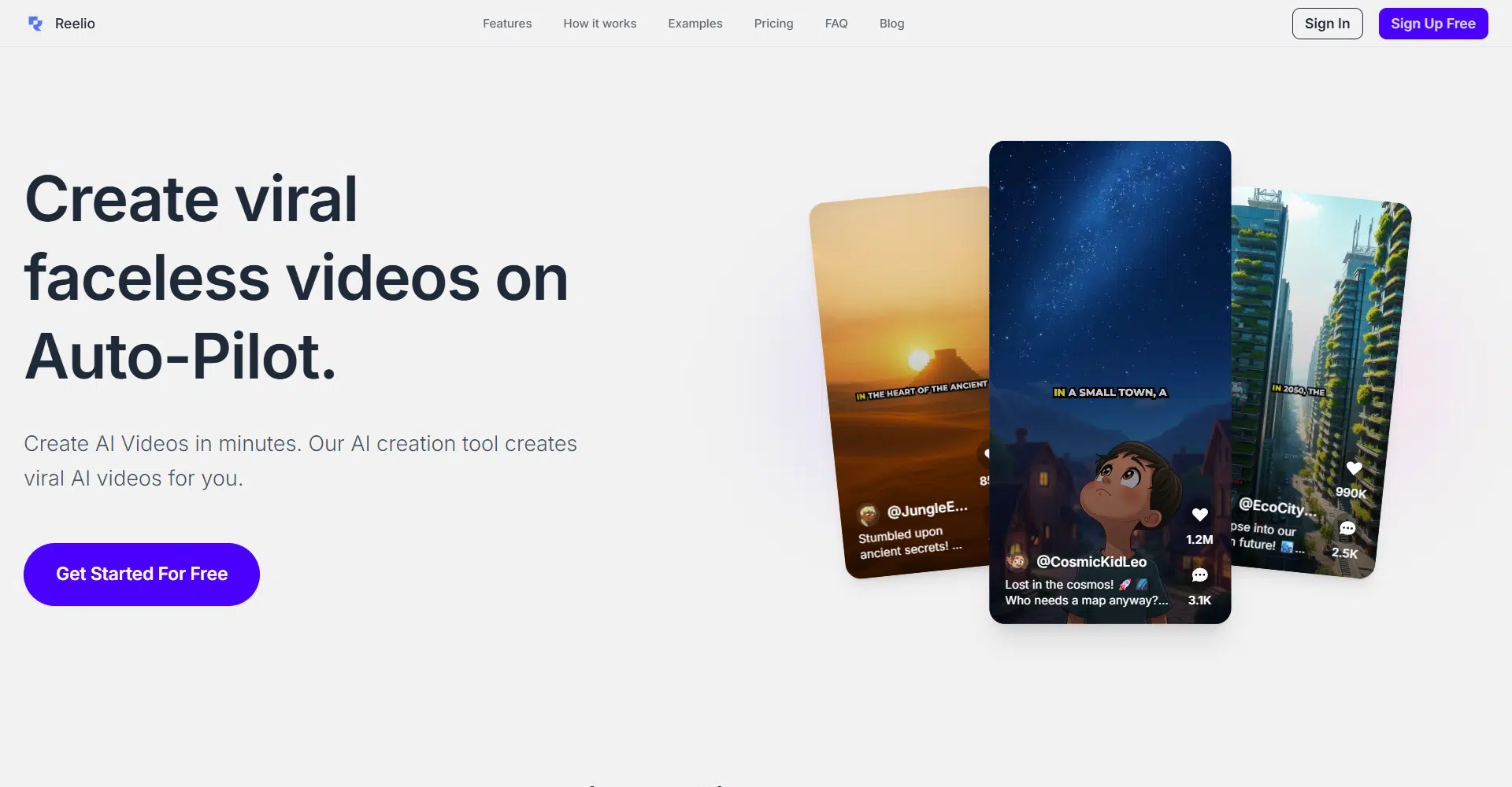 Reelio makes going viral effortless by automating the creation of high-converting Hook + Demo ads and continuous AI video series to help you dominate social media. With a perfect mix of creativity and technology, Reelio transforms your ideas into captivating videos quickly and easily — no camera needed.