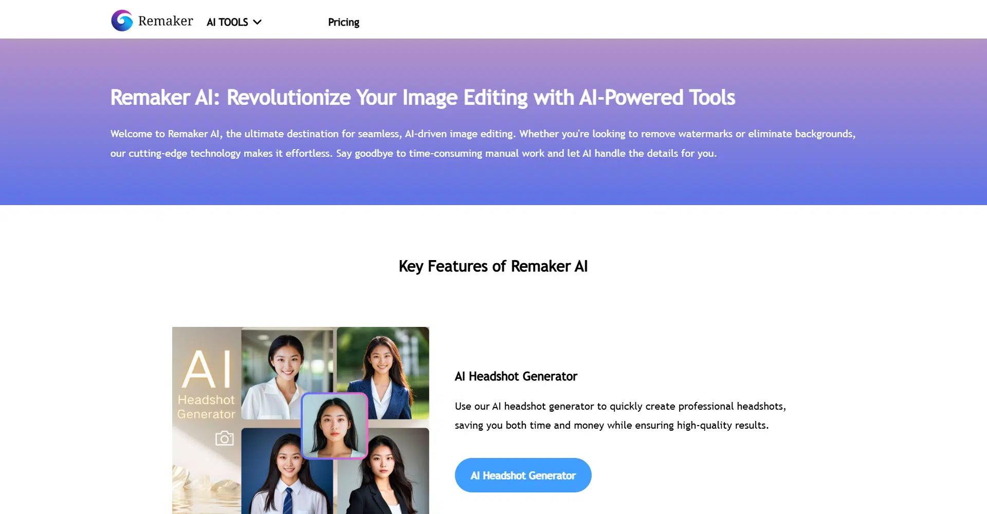 Remaker AI is the ultimate AI-powered platform designed to make your image and video editing tasks faster, easier, and more professional. Whether you need to create AI headshots, remove backgrounds from your product images, or upscale your photos to high-definition, Remaker AI has got you covered.