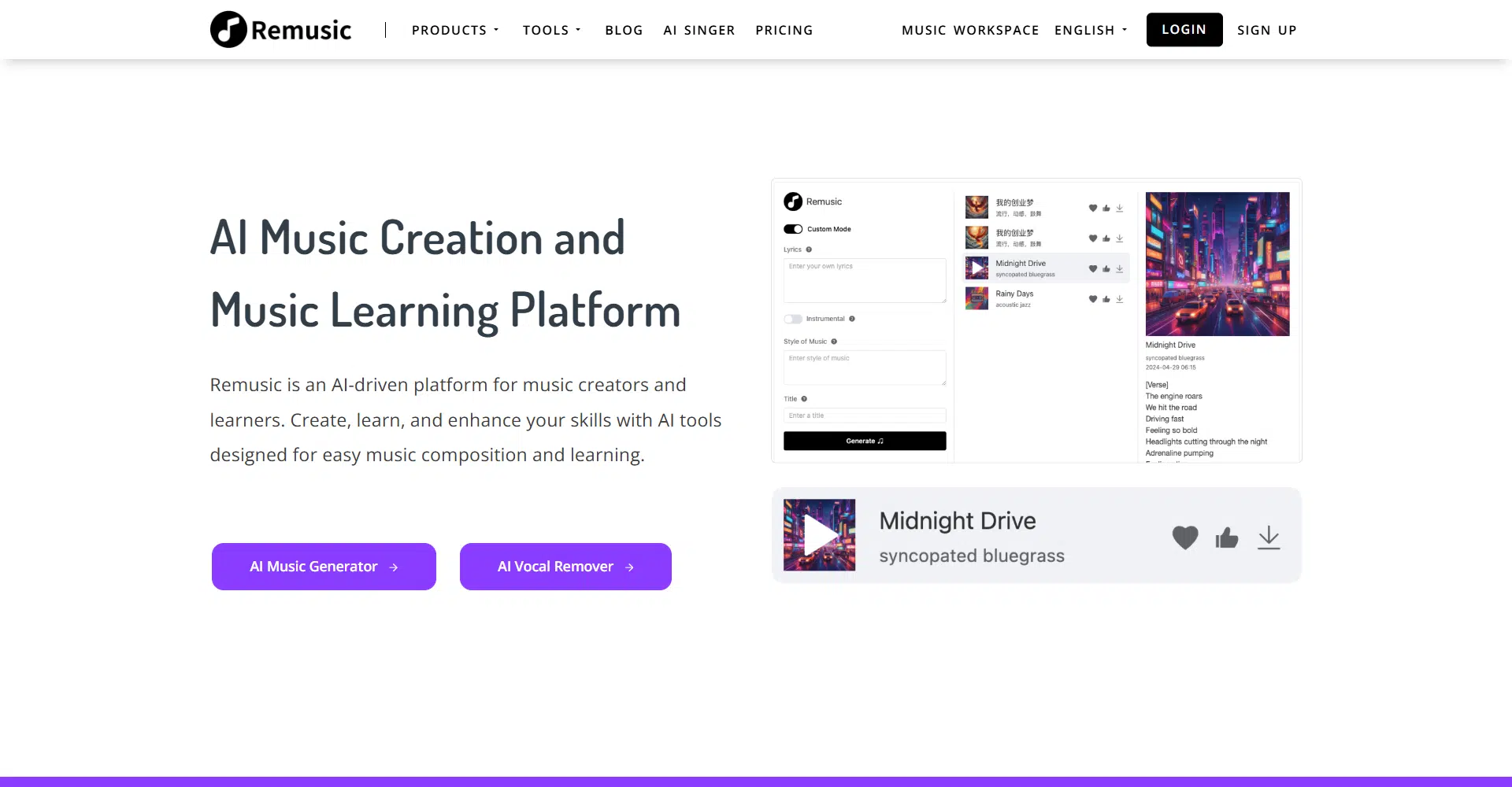 Remusic is a revolutionary AI-powered platform designed for music creators and learners, making music creation and skill enhancement easier and more accessible than ever. Whether you’re a budding musician, a seasoned creator, or someone simply looking to explore the world of music, Remusic offers a suite of tools to compose, learn, and grow with the help of cutting-edge AI technology.