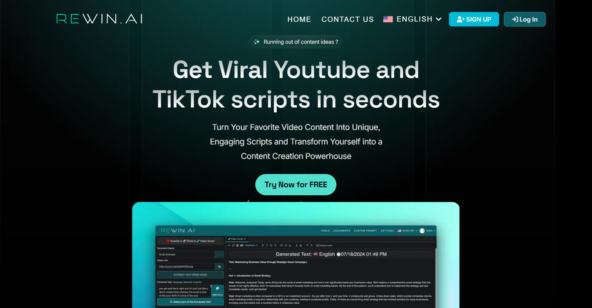 Rewin AI is a game-changing tool for content creators who want to create viral YouTube and TikTok scripts in seconds. Whether you’re a seasoned influencer or just starting out, Rewin AI helps you transform your favorite video content into unique, engaging scripts that capture attention and boost engagement.
