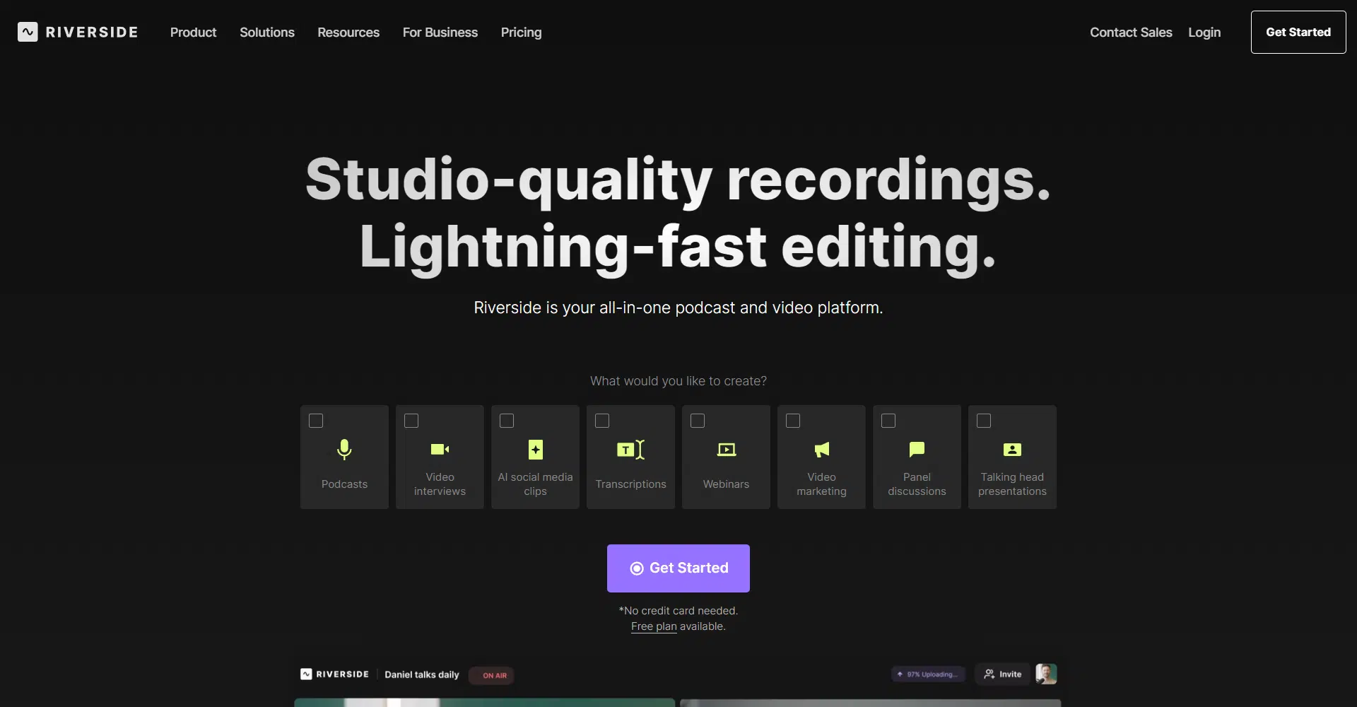Are you ready to experience Riverside? Dive in with a free trial—no credit card required. The free plan includes two hours of separate audio and video tracks for a one-time project, unlimited single-track recording and editing, up to 720p video quality, 44.1 kHz audio quality, and unlimited video calls. Unleash your creativity, save time, and elevate your content with Riverside today!