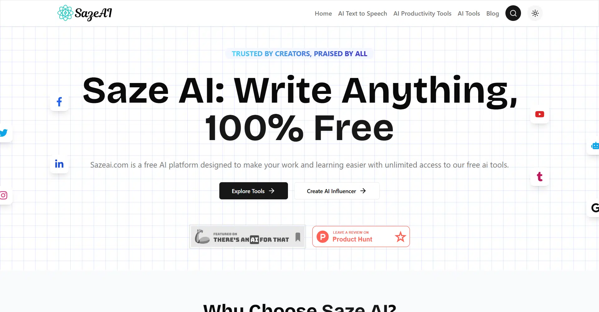 Saze AI is a powerful and innovative tool designed to help users write, generate images, and edit visual. Whether you’re a content creator, student, or professional, Saze AI offers a variety of tools to enhance your productivity and creativity. With over 40 AI tools, Saze AI provides a seamless workflow that saves time and effort while improving the quality of your work.