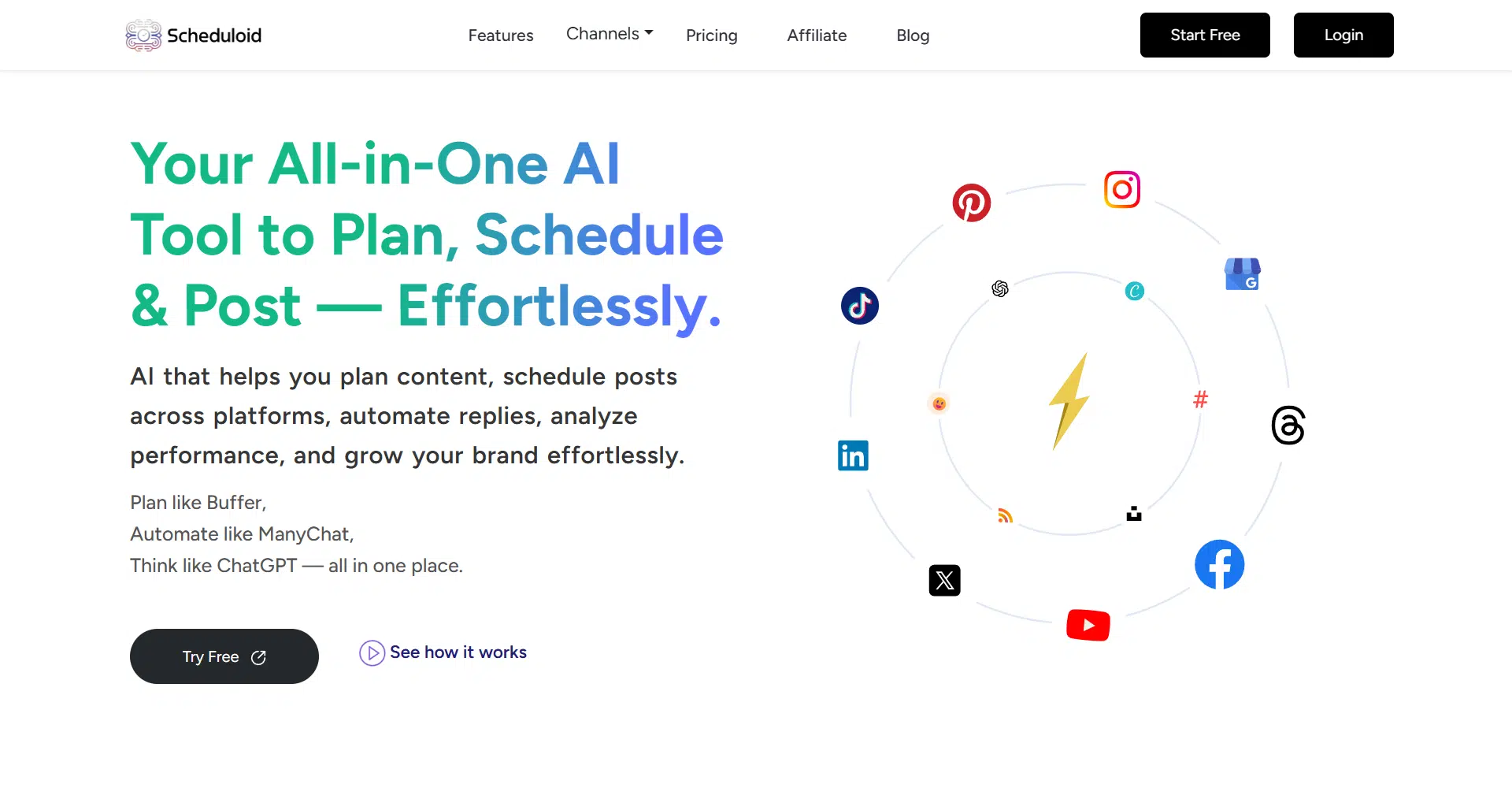 Write content like ChatGPT, schedule like Buffer, and automate like ManyChat. Scheduloid offers prebuilt templates, an intelligent AI assistant, and Unsplash stock photo integration—making post creation smooth and efficient. Simply type your idea, and watch the AI turn it into engaging content across platforms.
