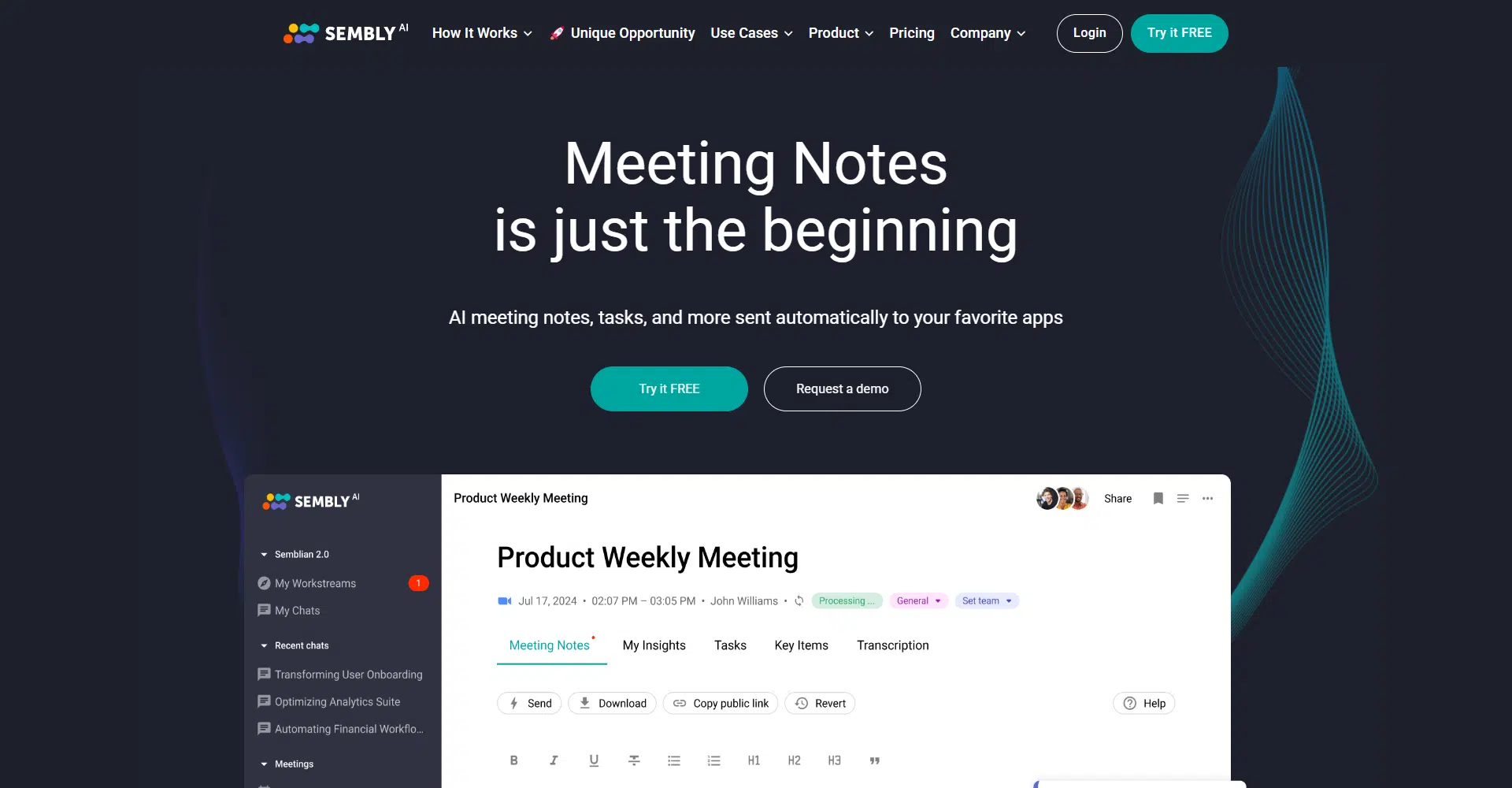 Sembly AI is your smart meeting assistant, designed to make every meeting more productive and efficient. It creates AI-powered meeting notes, so you can stay focused on the conversation while Sembly captures everything important—decisions, risks, issues, events, and key requirements. It also generates clear summaries in your preferred language, helping teams stay aligned with ease.