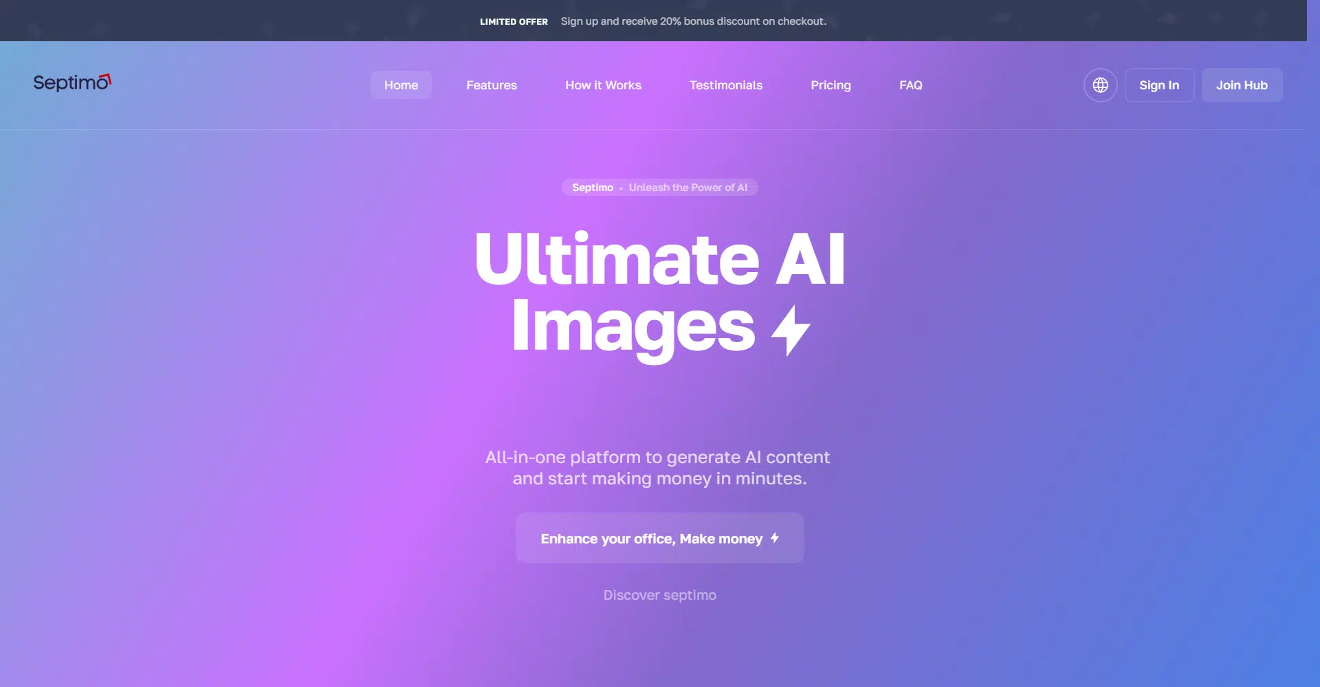 Septimo is the ultimate all-in-one AI content generation platform built to supercharge your creativity, productivity, and income—without the need for complex tools or multiple subscriptions. With Septimo, you can generate AI-powered text, images, code, voiceovers, chat responses, blog posts, ads, emails, and even videos from a single, user-friendly dashboard.