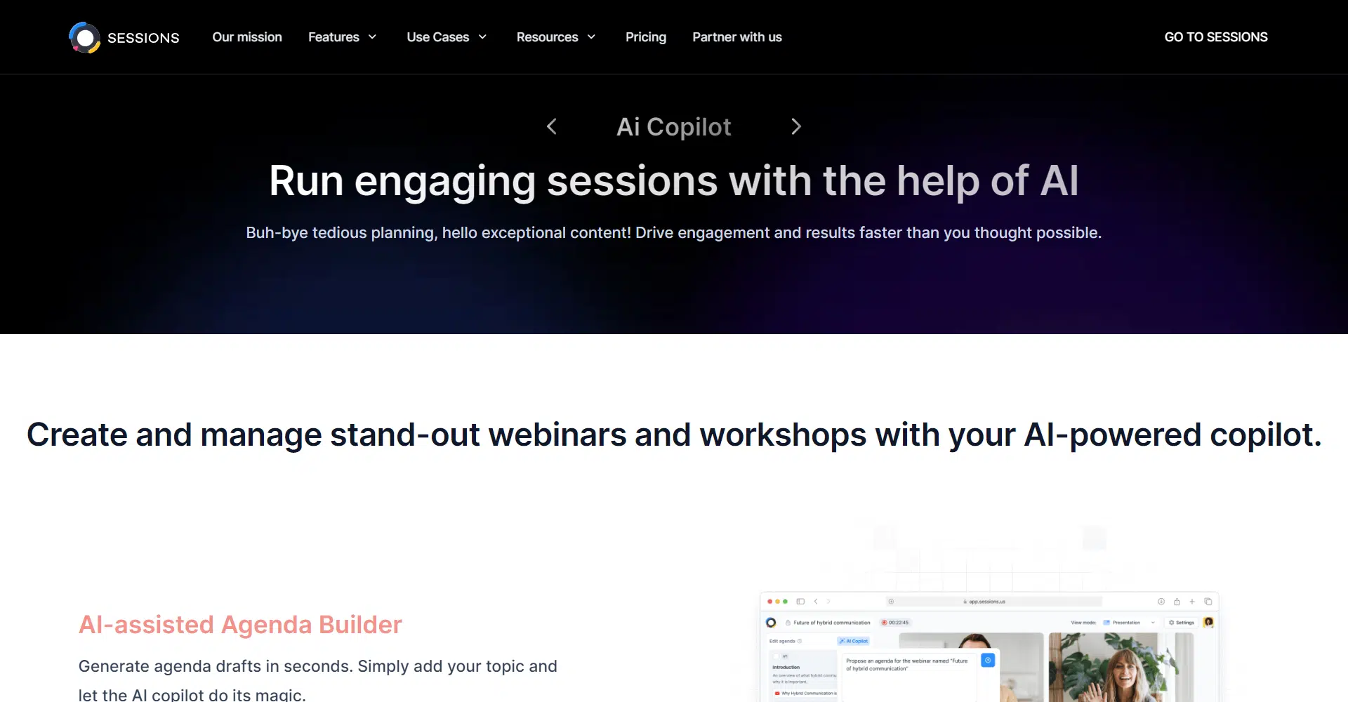 Sessions AI is your ultimate AI-powered copilot for creating and managing engaging webinars and workshops effortlessly. Say goodbye to tedious planning and hello to exceptional content and seamless management. With Sessions AI, you can drive engagement and achieve results faster than ever before.
