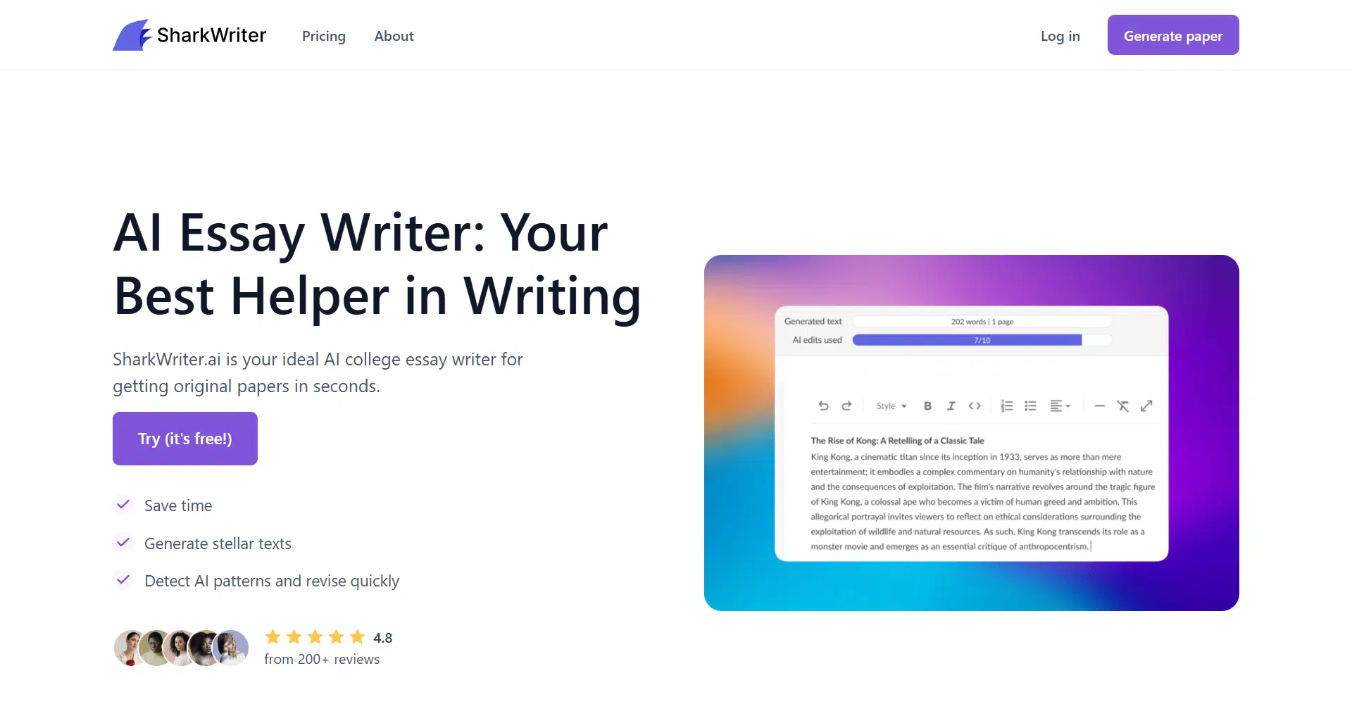 Shark Writer is your complete writing solution, combining the speed of an AI essay writer with the precision of human editing. If you struggle with starting essays or want your writing polished to perfection, this tool makes academic writing simple, professional, and affordable. In just a few clicks, you can generate a full essay draft with AI and then request a human expert to refine it for clarity, structure, and style. The result is a paper that looks natural, follows academic standards, and is ready for submission.